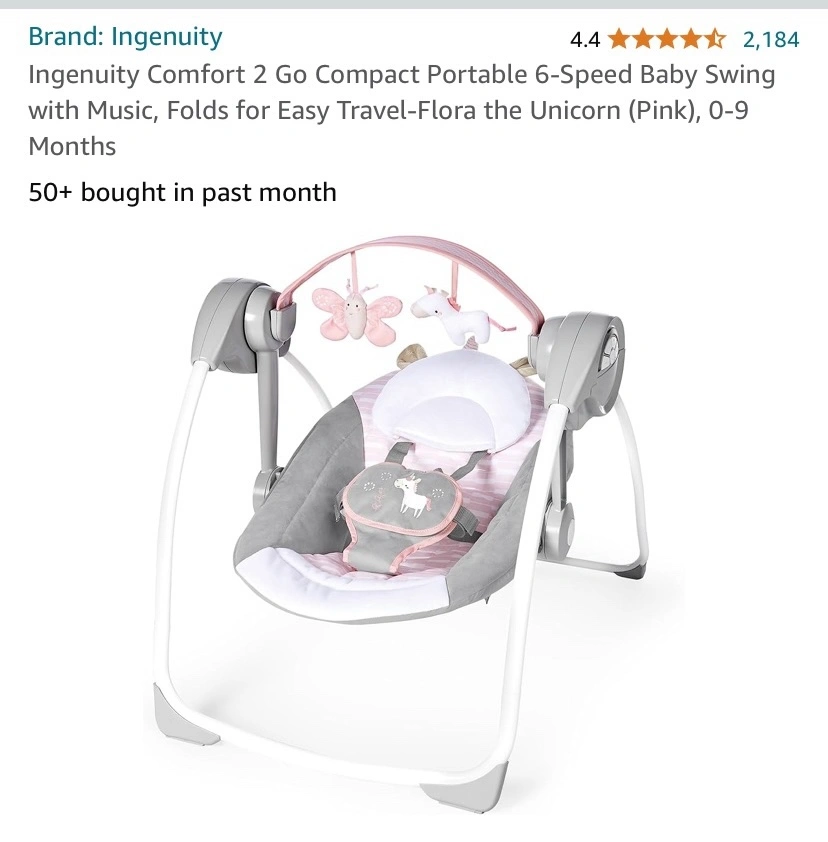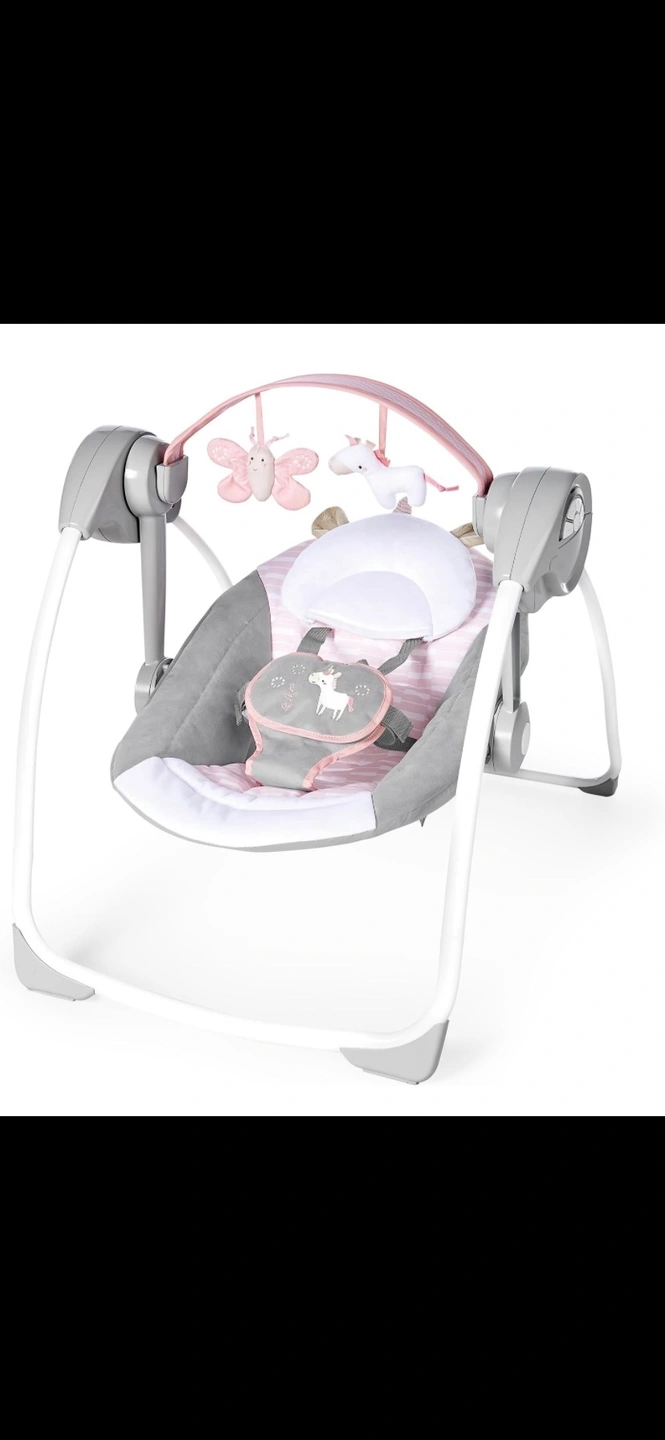 34This baby swing features six speeds and a variety of soothing sounds. It folds for easy travel. I unfortunately dissembled the swing before taking a photo. My daughter barely used the swing and is like new.