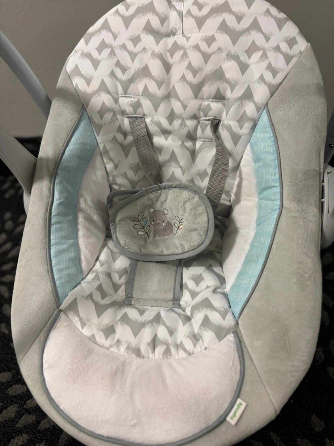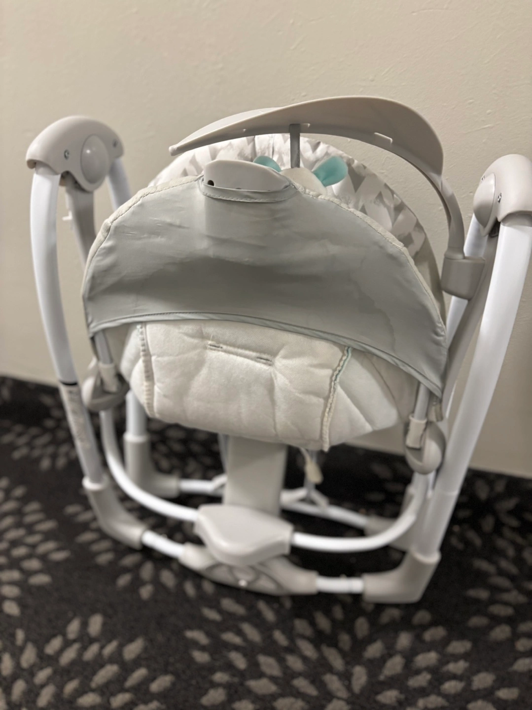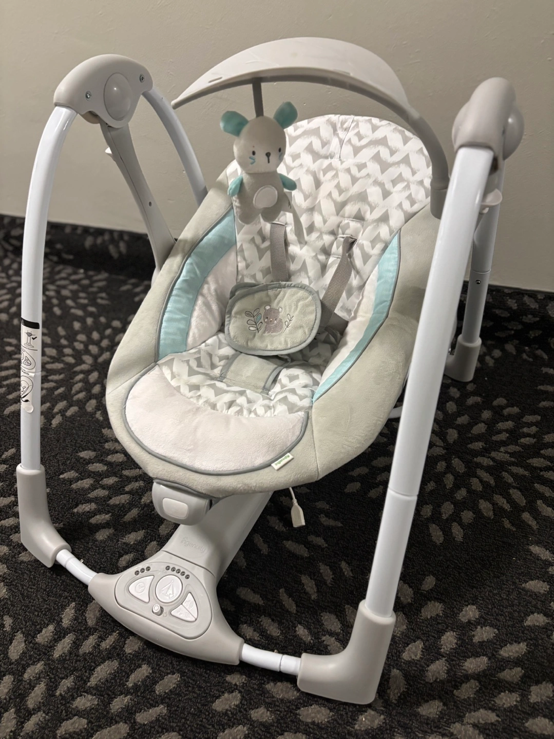 Baby swing and infant seat. Portable, automatic, battery-powered. Nature sounds and vibrations. Suitable for 6–20 lbs. Grey and teal colour scheme. Used. Motor for the swing is in good condition.Used only for 3mos,Baby outgrew it. Pick up Only Danforth and Dawes Cash Only
