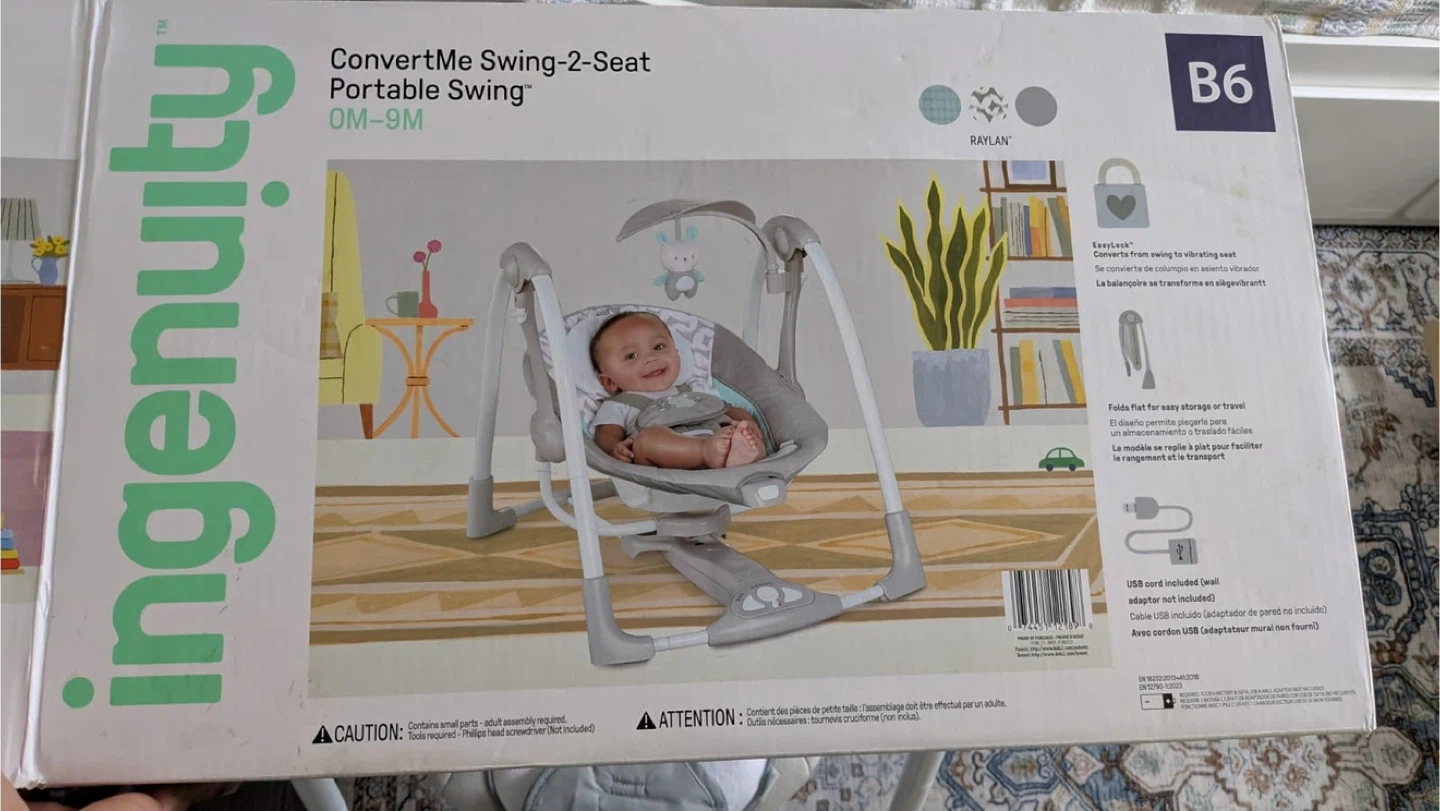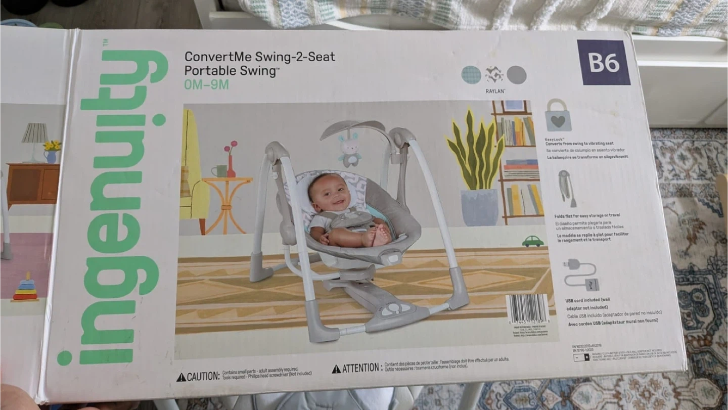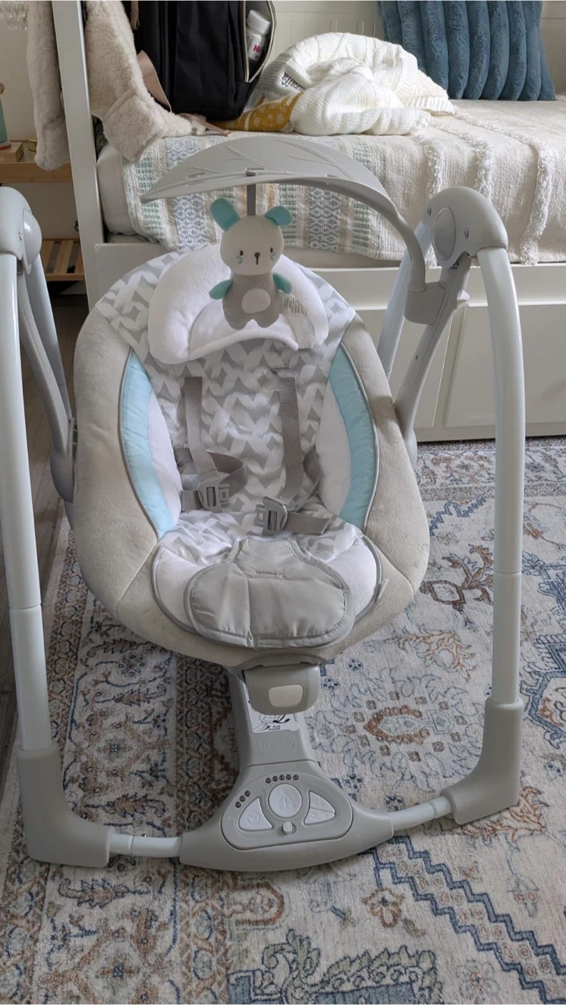 10Selling an Ingenuity ConvertMe Swing-2-Seat portable swing, suitable for babies from 0 to 9 months. It's in Brand new condition and comes with a USB cord included (wall adapter not included). This swing converts from swing to vibrating seat and folds flat for easy storage or travel. It's a super handy item to have!