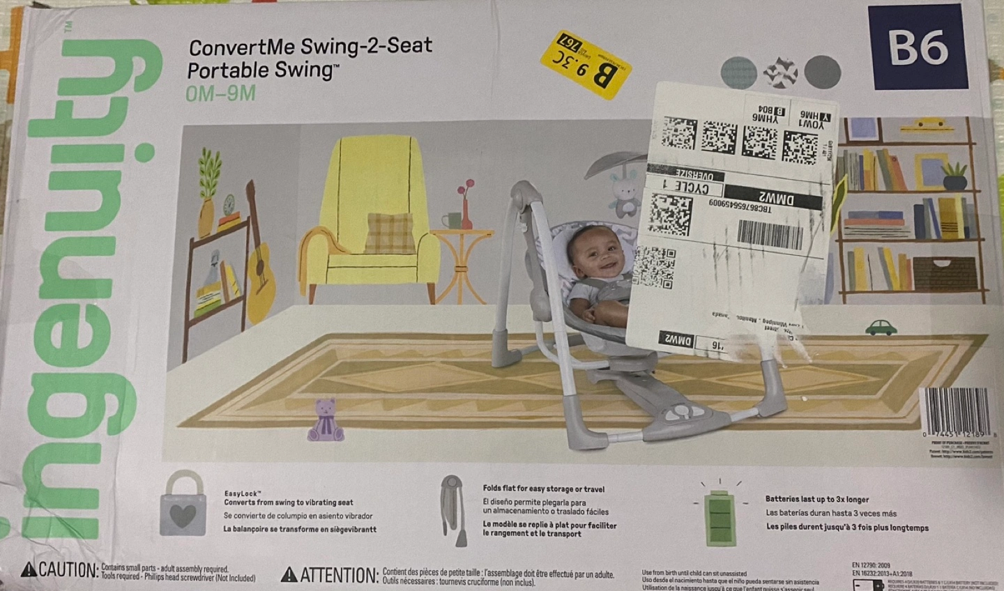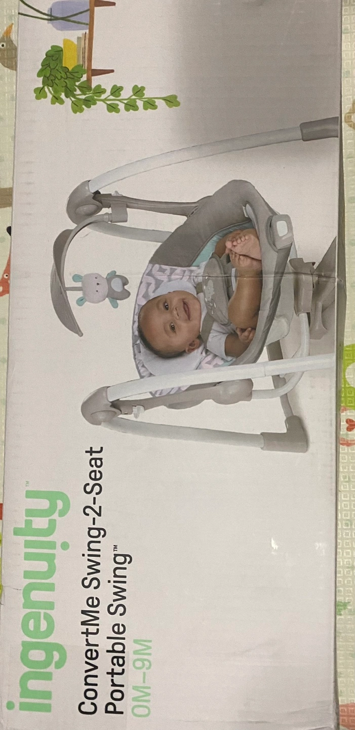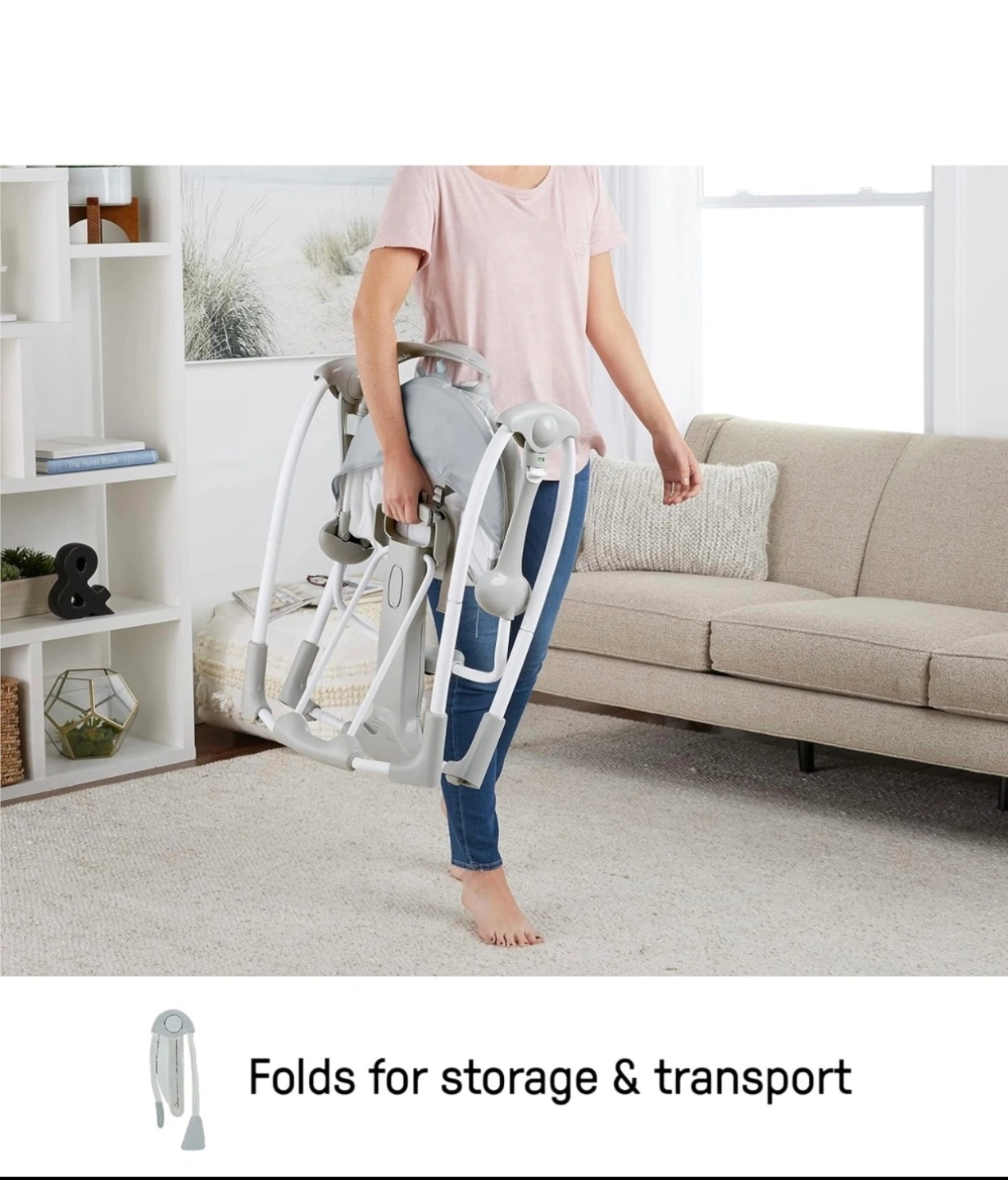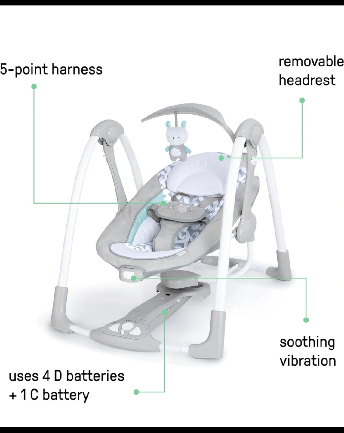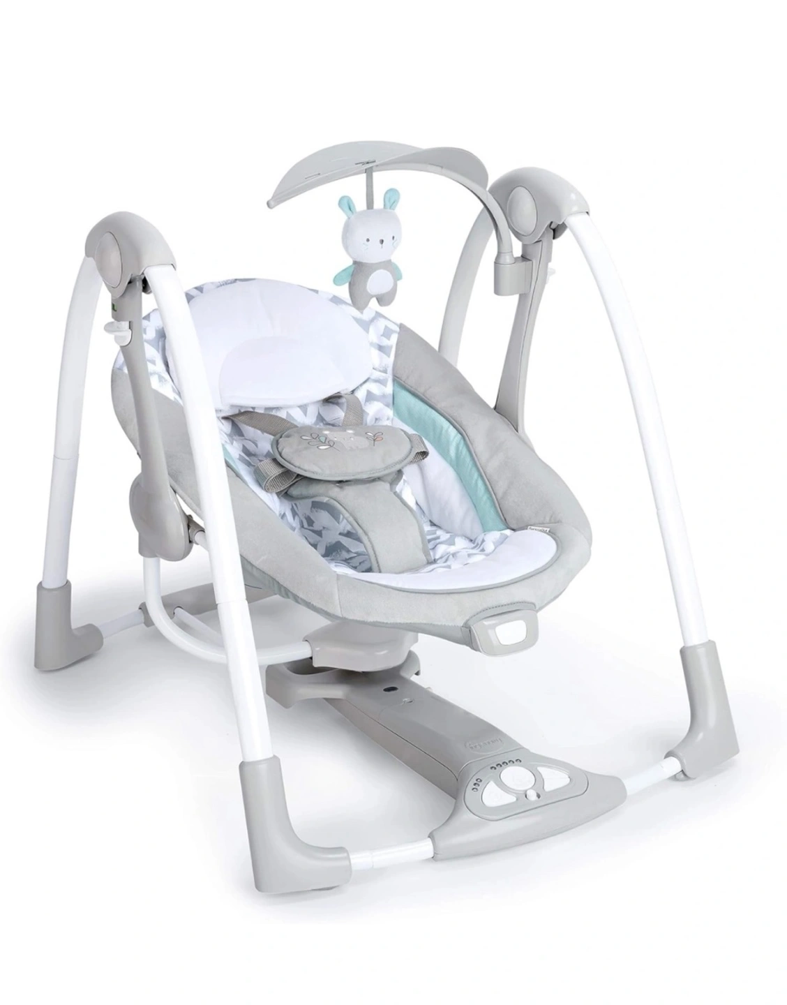 10Baby swing in grey and blue with a cute little toy. It comes with a 2-seat swing that can be used for a baby or toddler. The swing has a vibration setting, a music setting, and a timer. It folds up compactly for easy storage and portability.