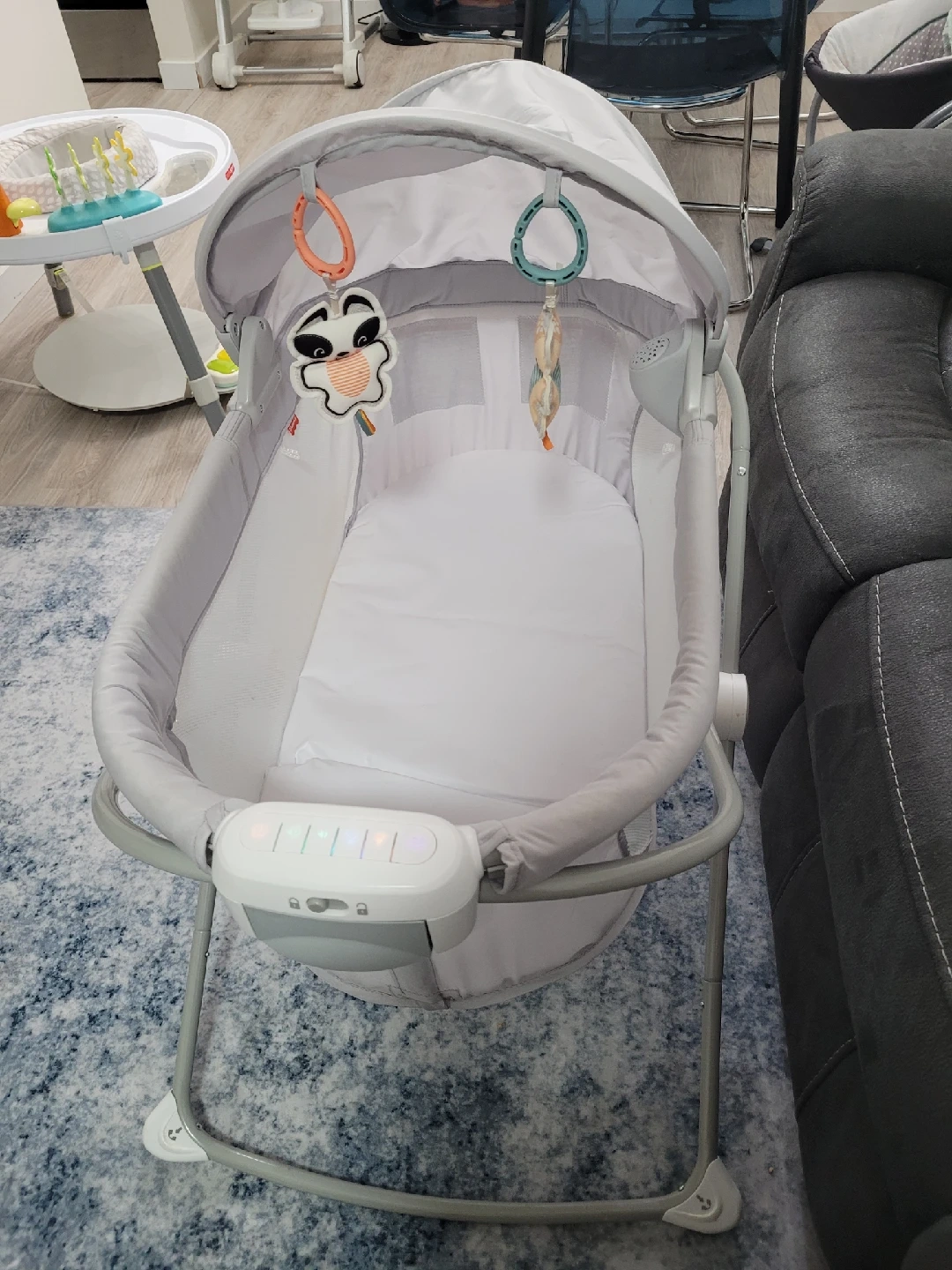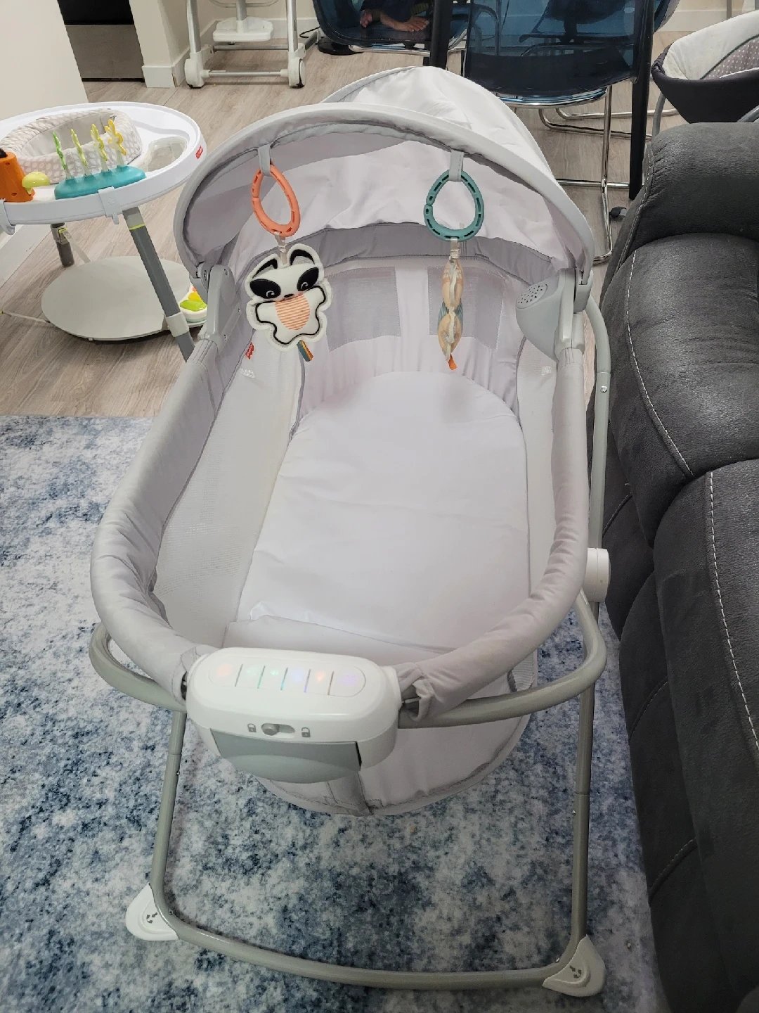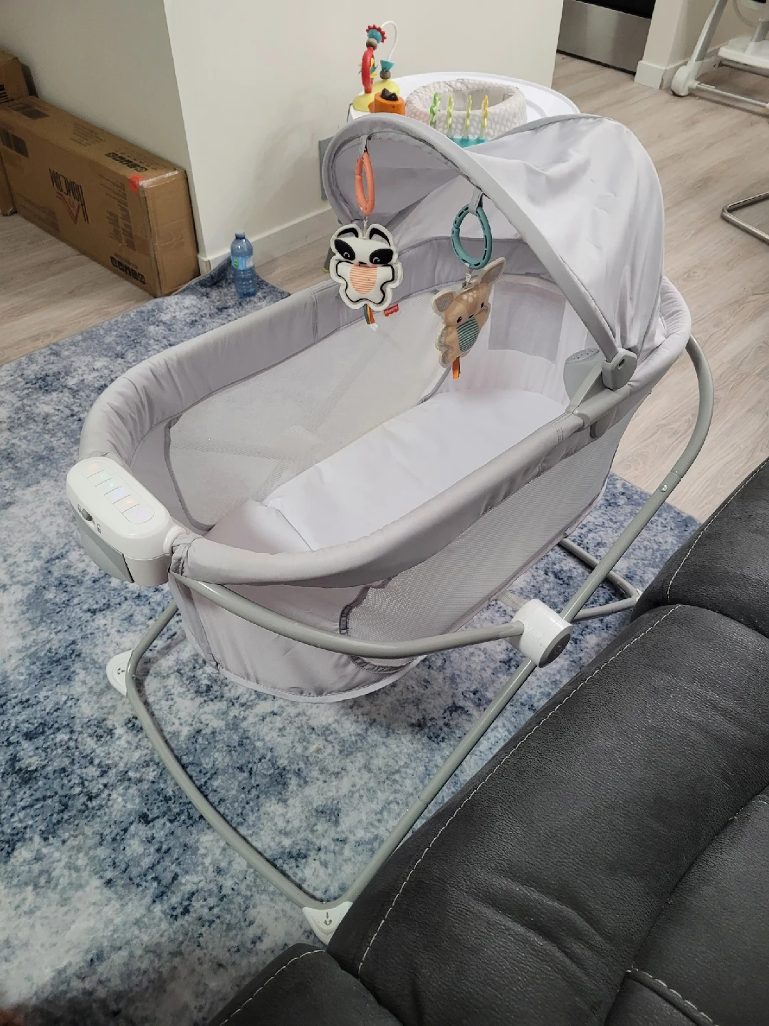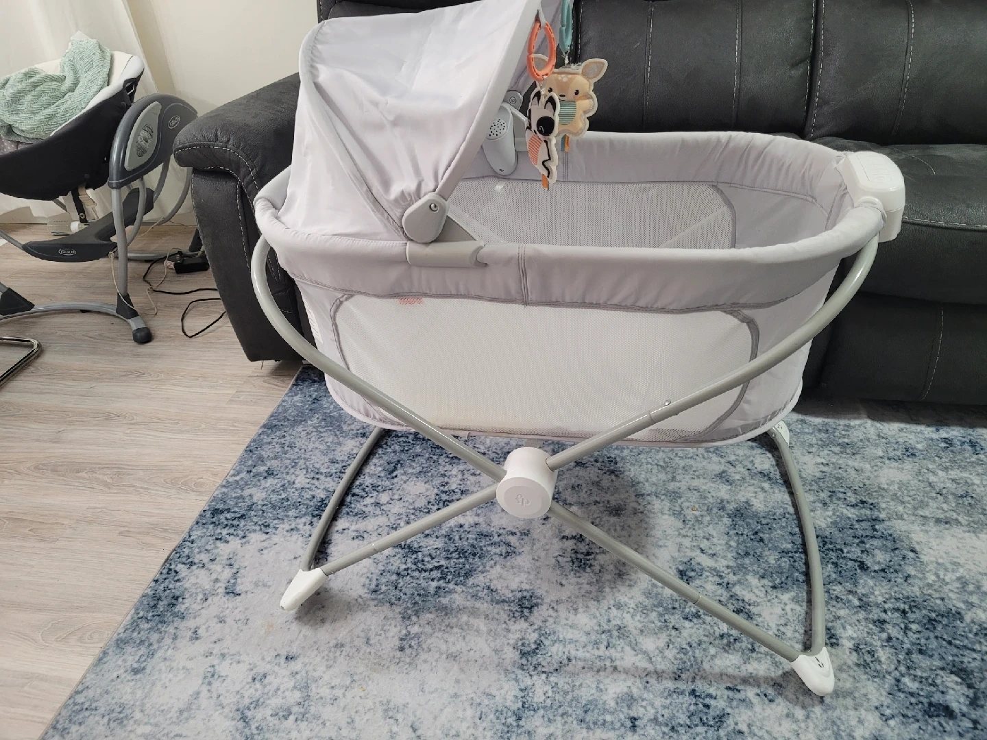 10Selling a gently used Ingenuity FoldAway Rocking Bassinet. It's in great shape and ready for a new little one! The bassinet is a soothing and convenient option for newborns. It features a rocking mode to gently lull your baby to sleep and easily folds away for storage or travel. Comes with hanging toys to entertain your baby!