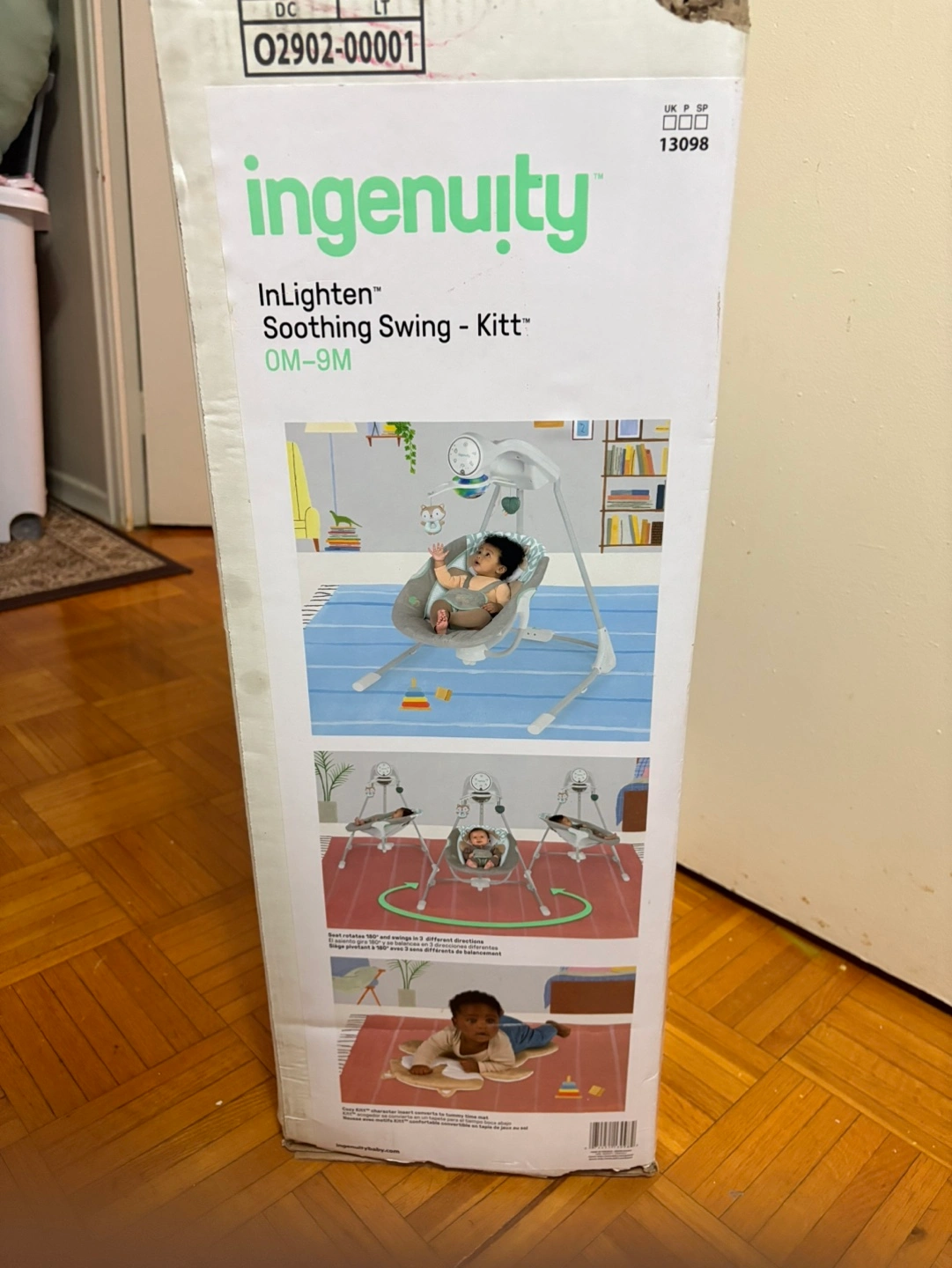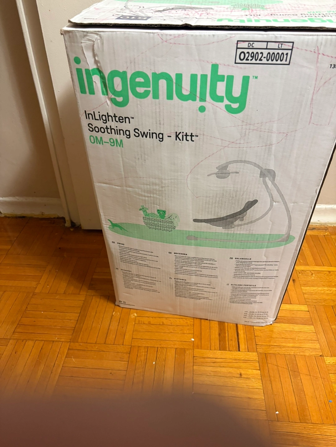 Barely used box baby swing. Model OM-9M. Features multiple settings and soothing sounds.