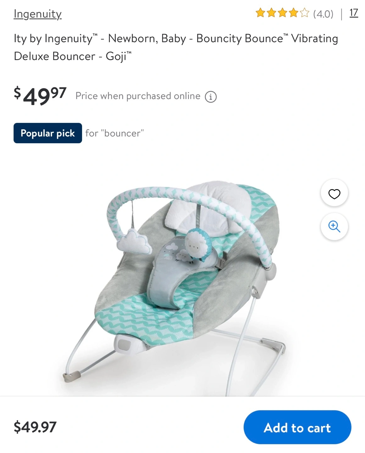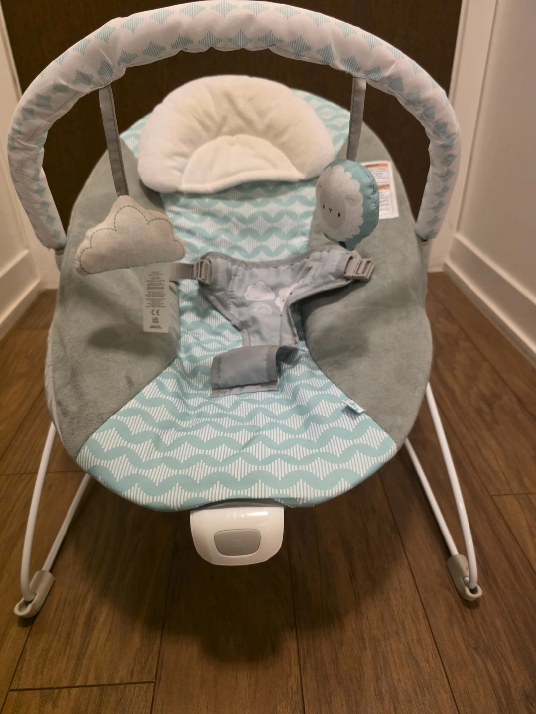 Selling an Ity by Ingenuity newborn baby bouncer in the Goji style! This is a vibrating deluxe bouncer that your little one will love The condition is pretty good