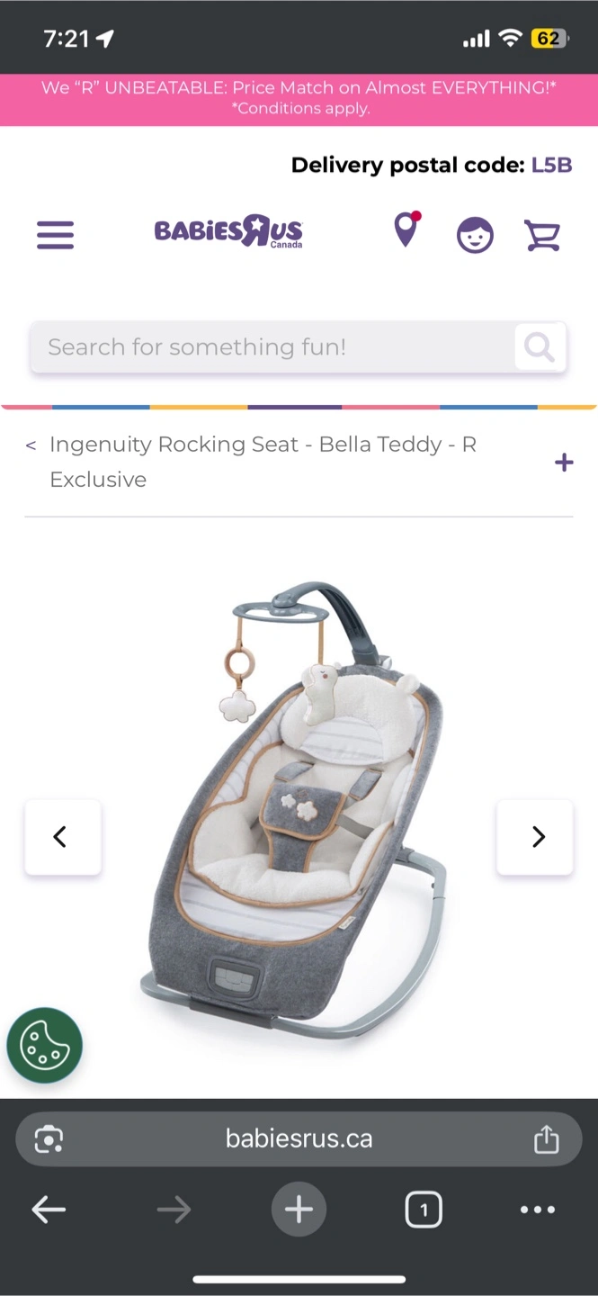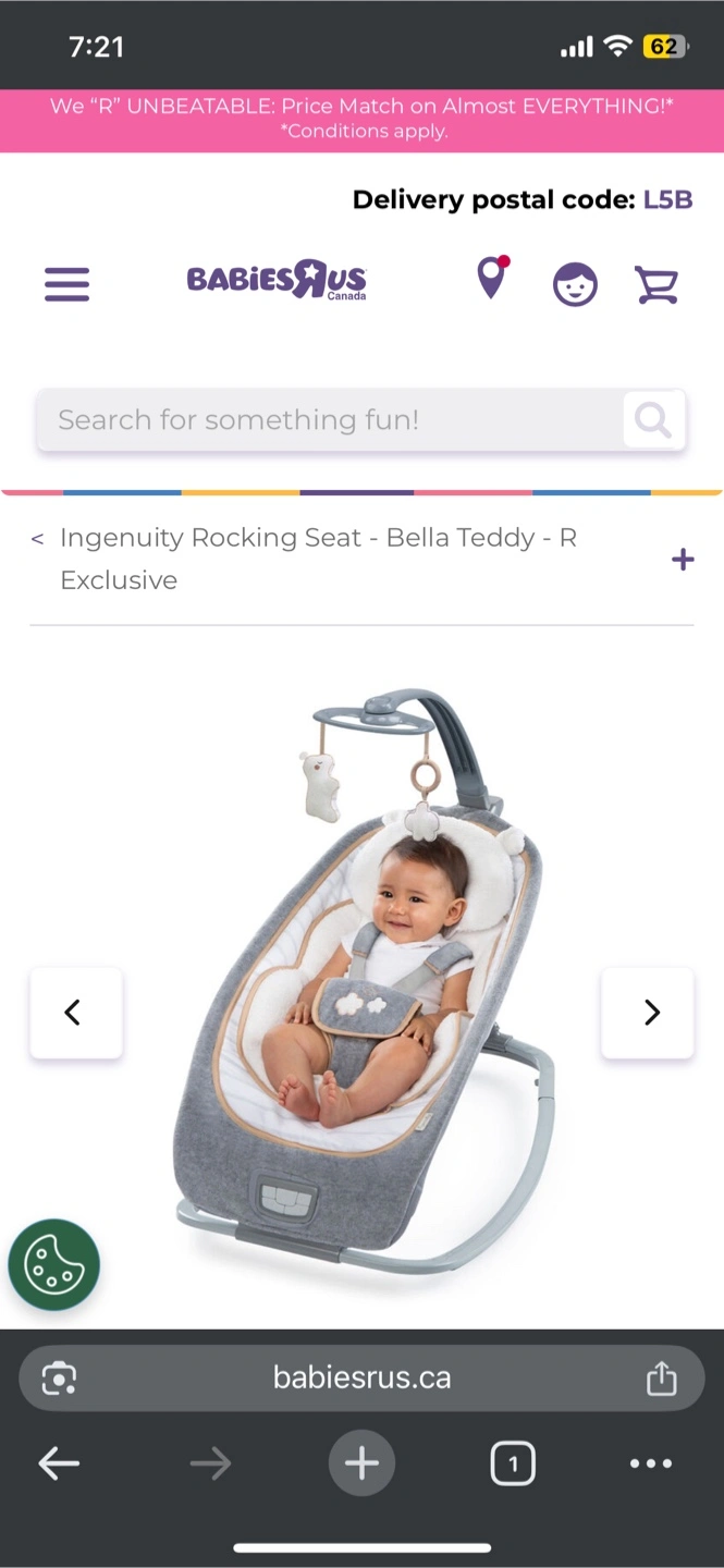 Looking to sell an Ingenuity Rocking Seat - Bella Teddy - R Exclusive! It features premium, plush fabrics that surround baby in softness. The contemporary designer look will be a great addition to your home. It entertains baby with soothing vibrations, music, and nature sounds with volume control. The adorable character head rest is wrapped in plush fabric and supports smaller babies, but removes as baby grows. It also has unique recline options - three very distinct recline positions provide more options for baby's comfort