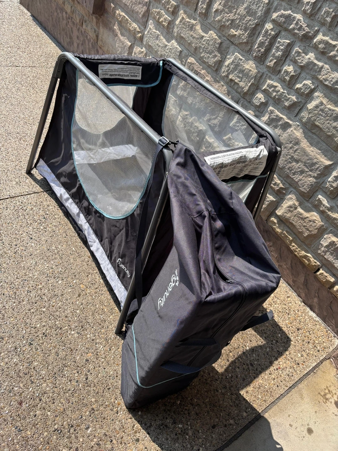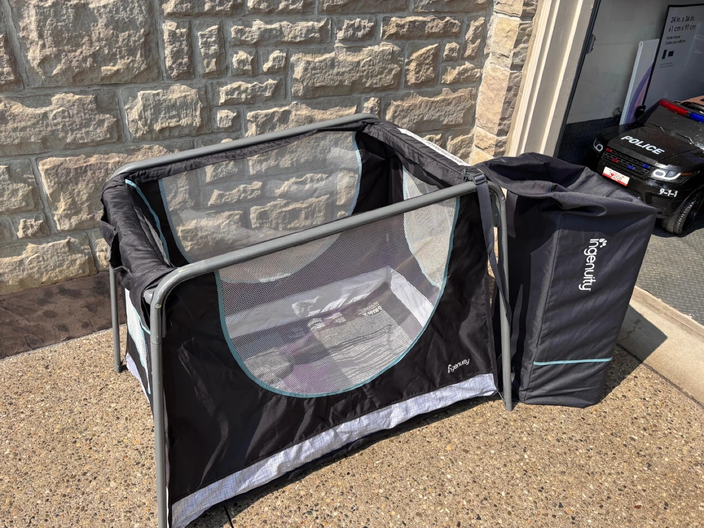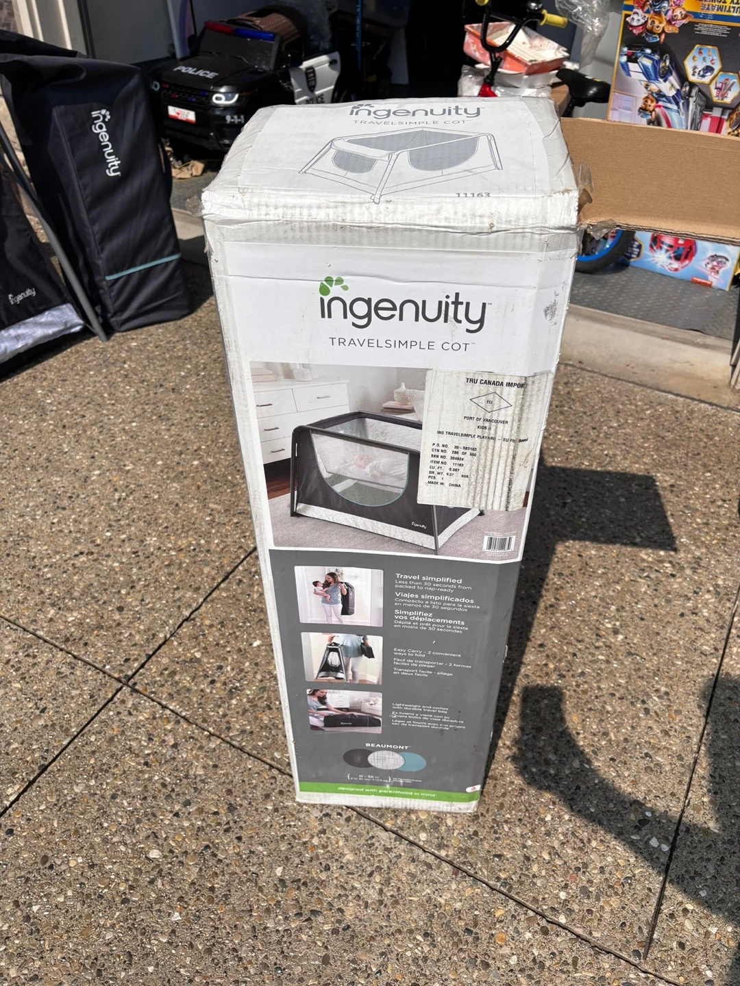 Selling an Ingenuity Travel Simple Cot! It's in like-new condition and comes with its original box. Perfect for travel or small spaces, this cot is easy to set up and take down. Lightweight and portable, it's a great solution for families on the go. Can be used indoors or outdoors for playtime. Comes with a travel bag.