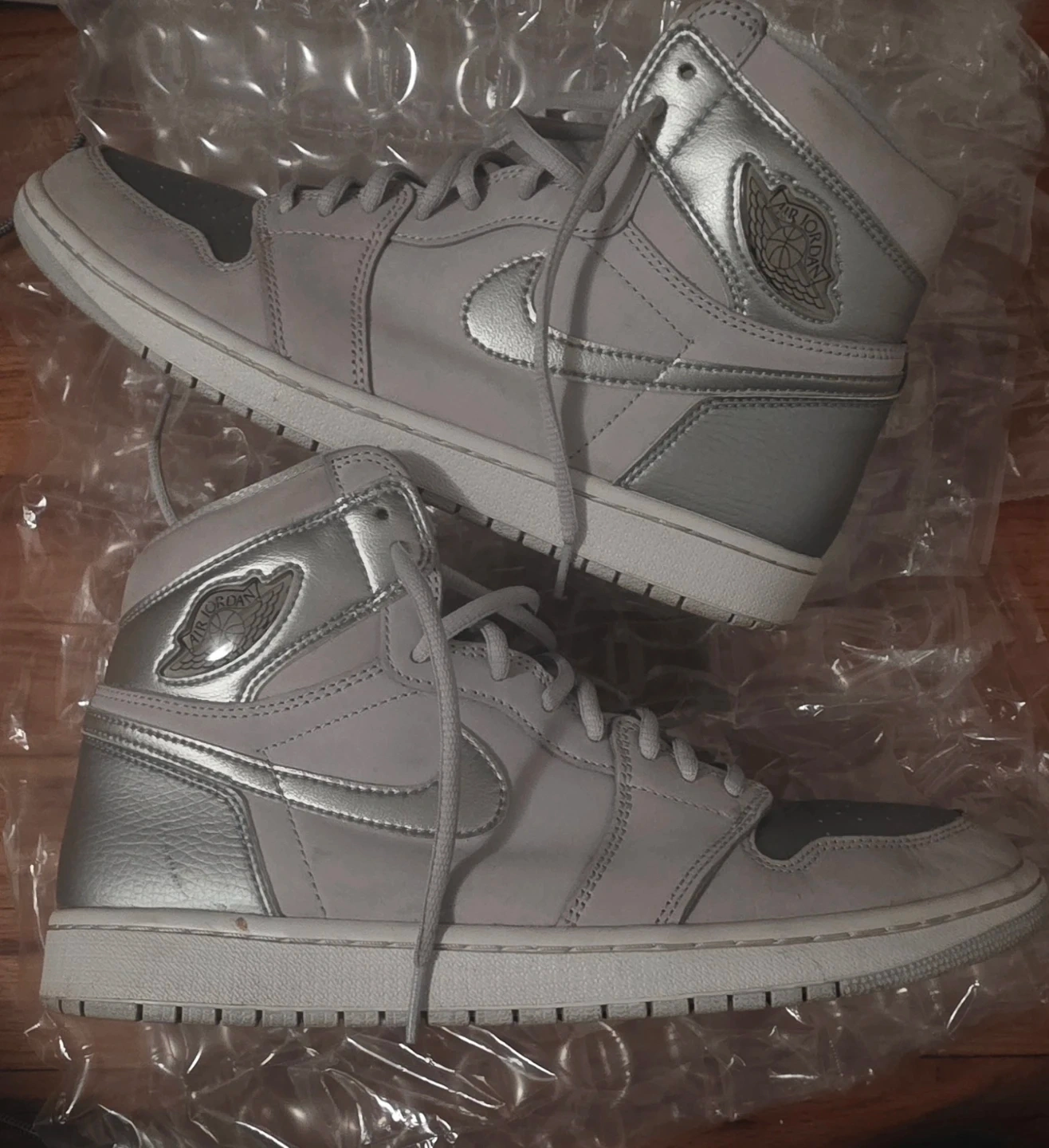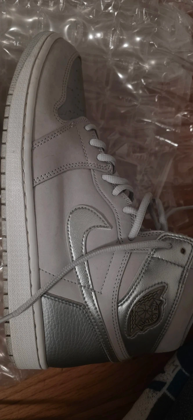 Air Jordan 1 Retro High OG sneakers in silver and white. Size 11 US, 10 UK, 45 EUR, 29 CM, 290(2.5) CN. Made in China. These are a great addition to any sneaker collection! Used need some cleaning doesn't come in a box selling these for a low price