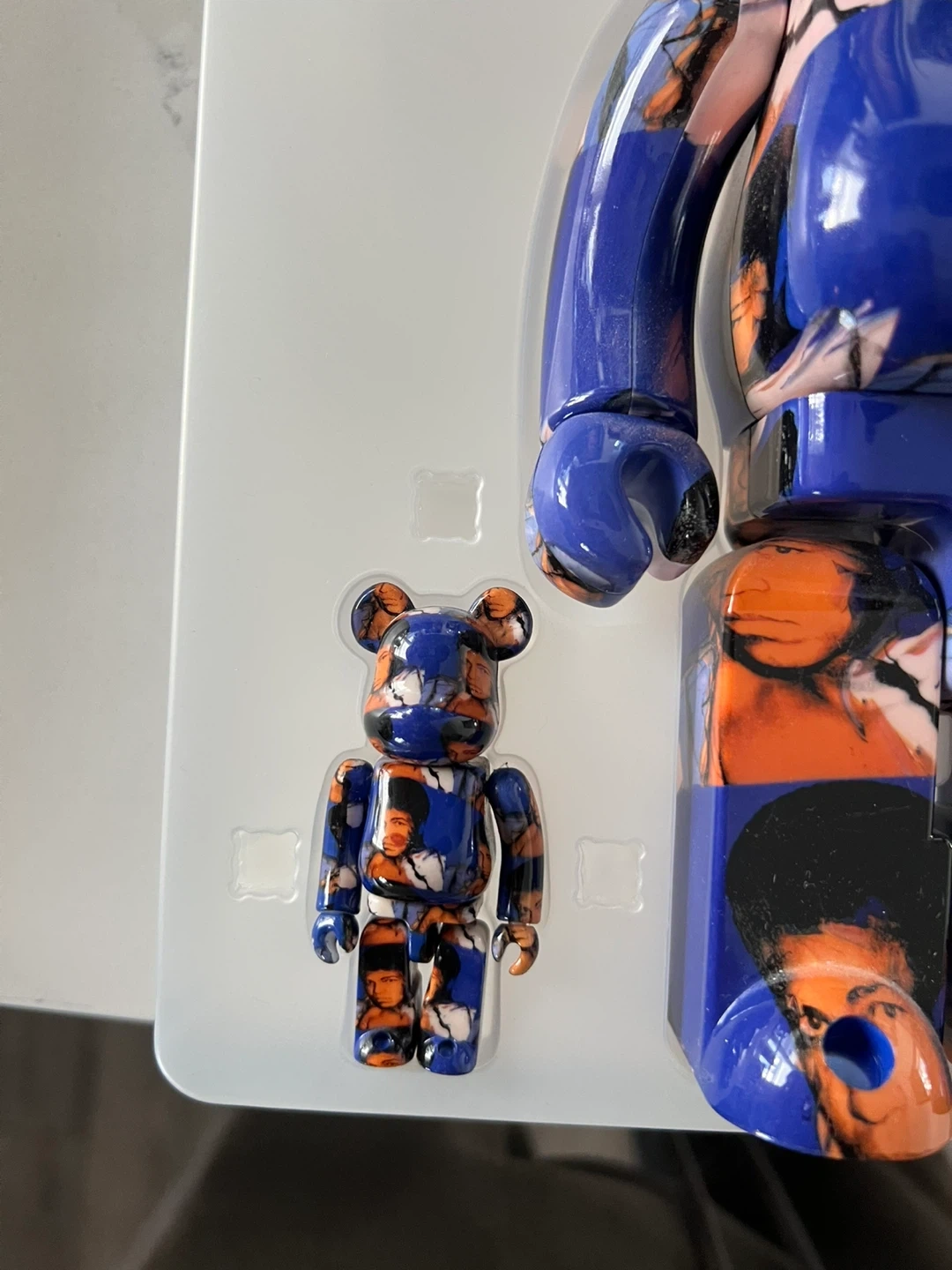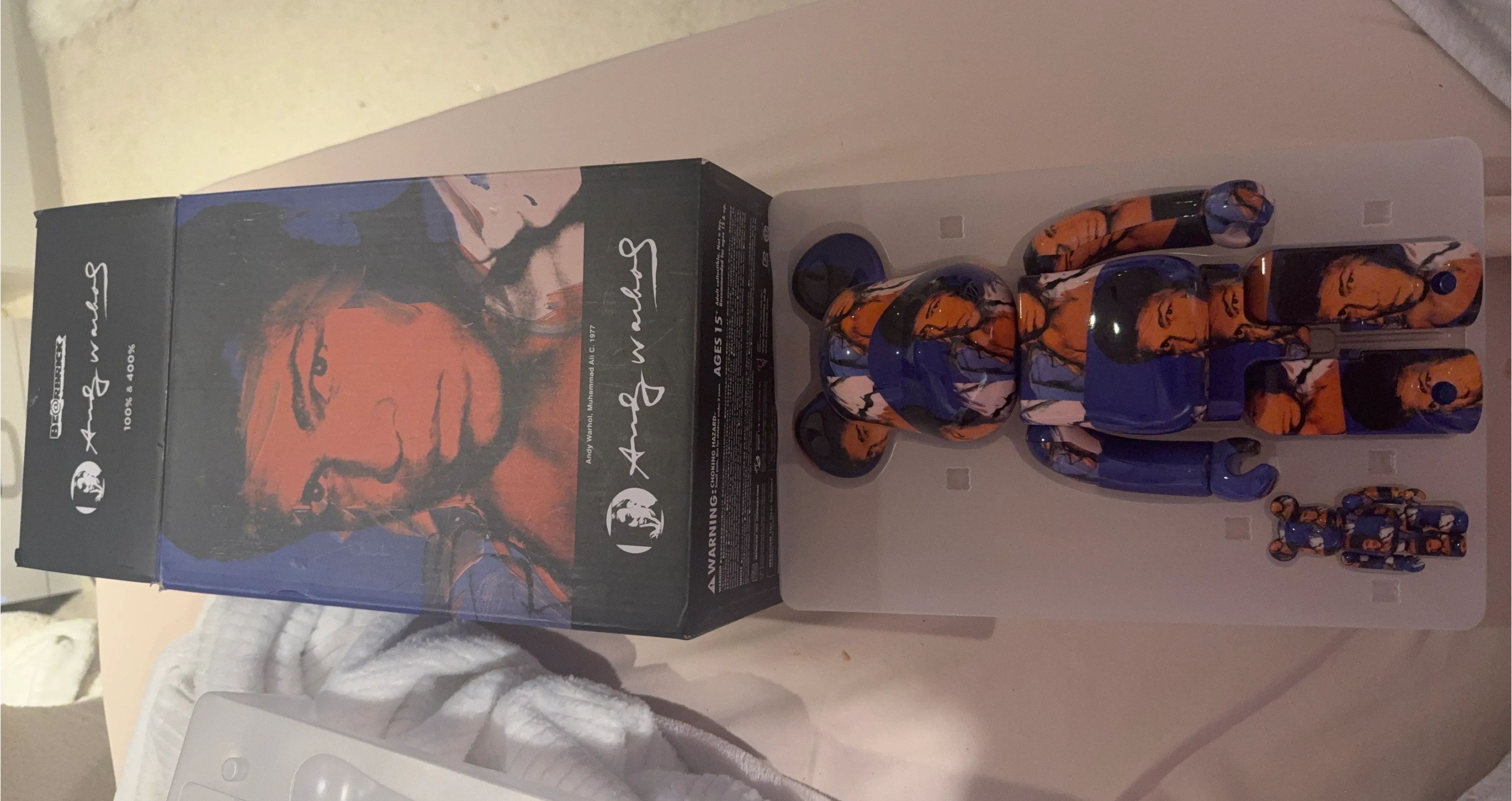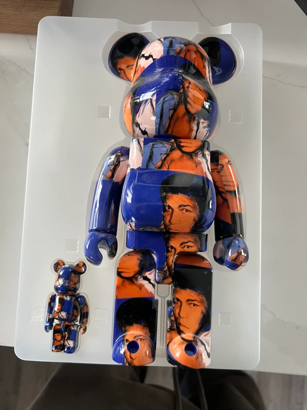 This is the Andy Warhol Muhammad Ali Bearbrick figure. It comes with a smaller matching mini-figure. The design features Muhammad Ali's iconic portraiture.