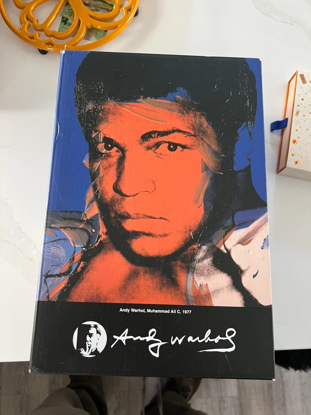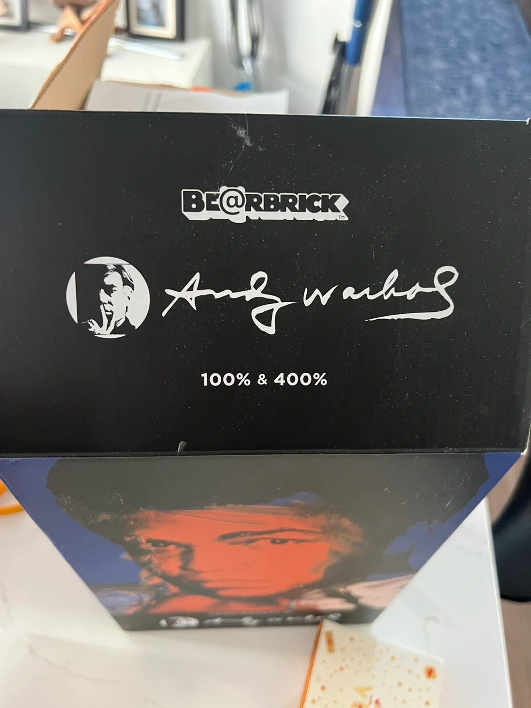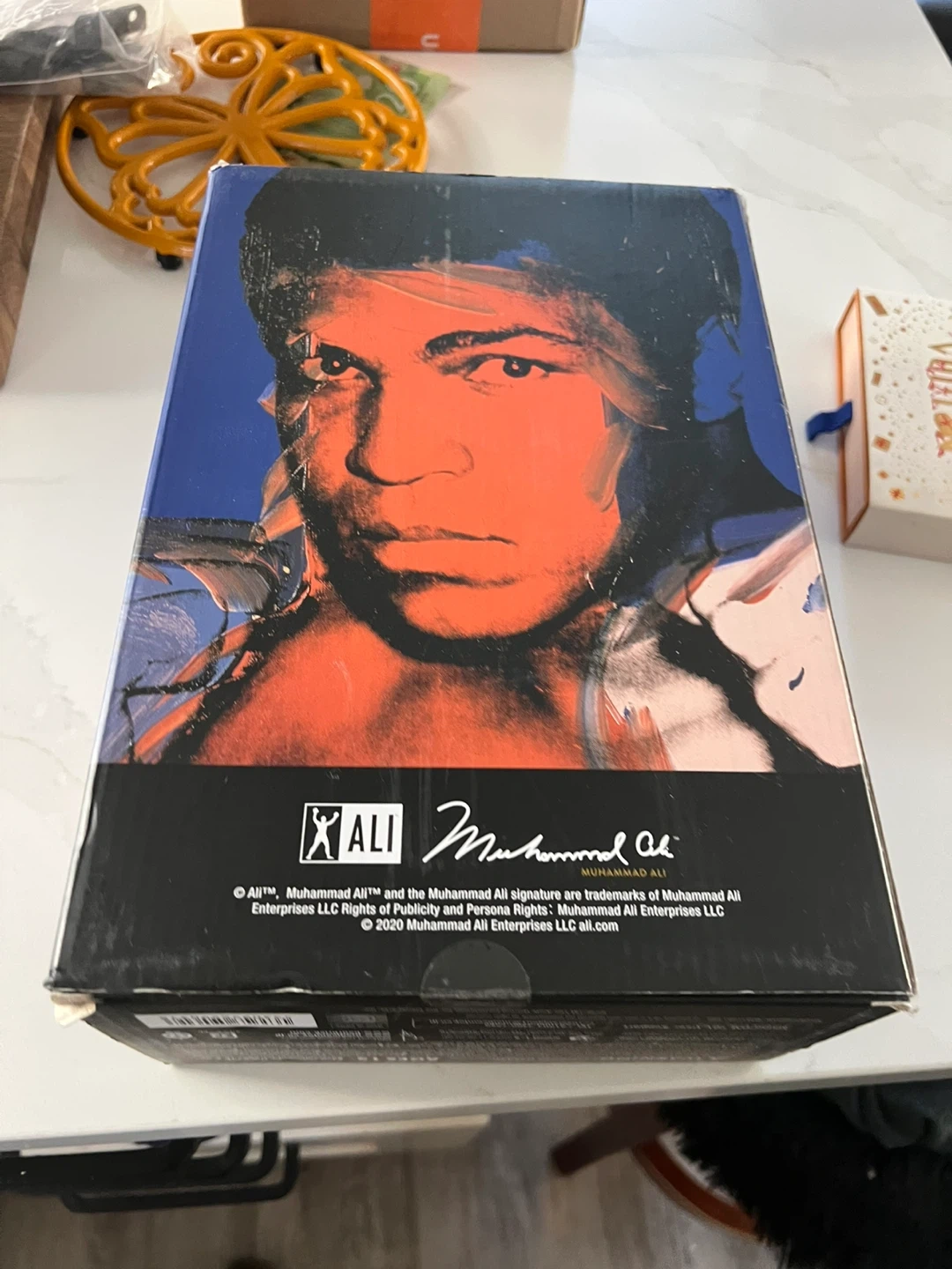 This is the Andy Warhol Muhammad Ali Bearbrick figure. It comes with a smaller matching mini-figure. The design features Muhammad Ali's iconic portraiture.