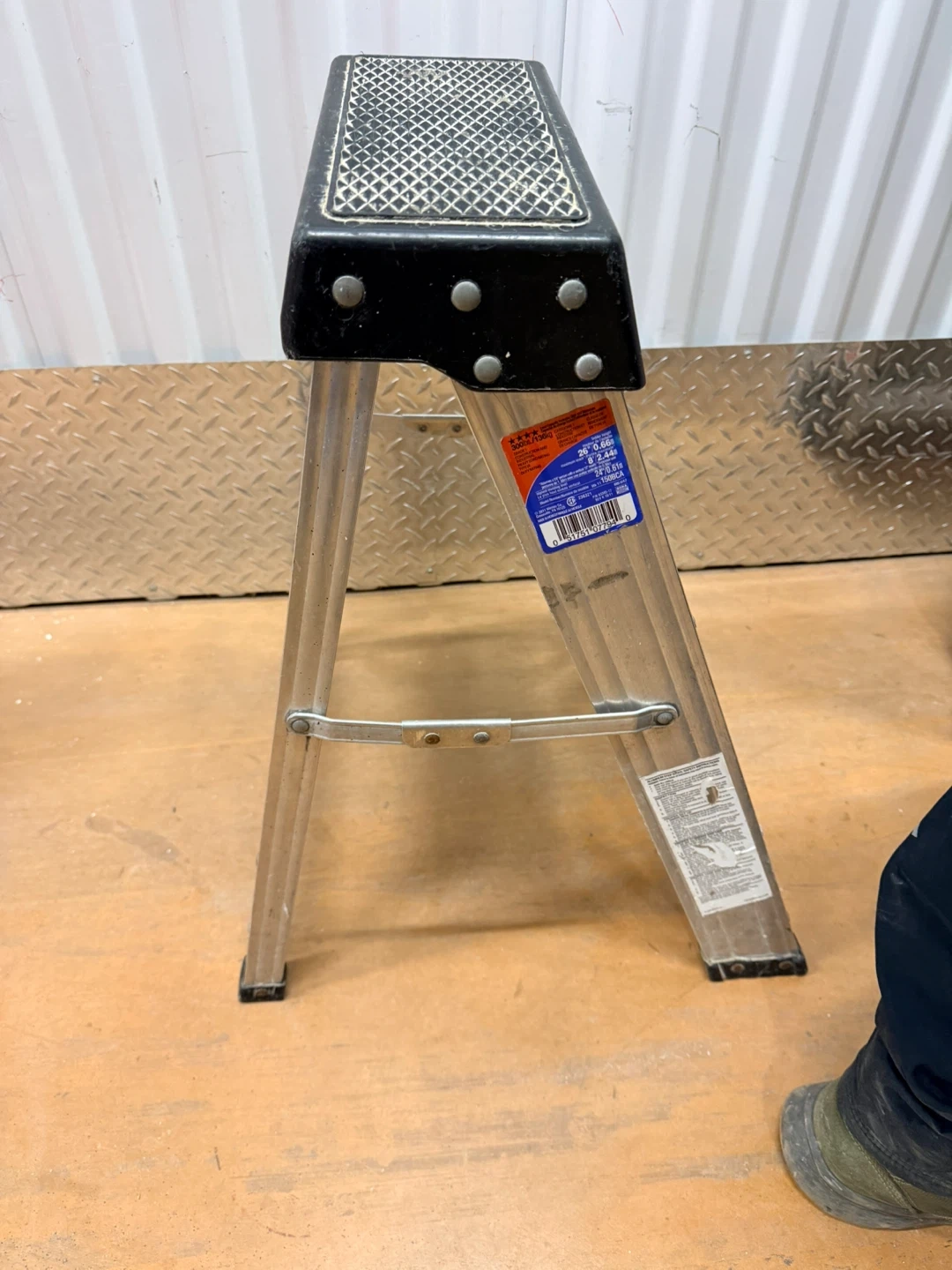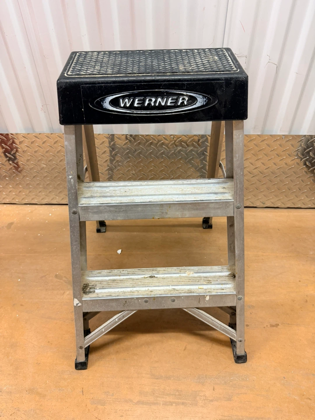 This is a Werner 3-step aluminum step stool. It has a maximum standing height of 24" (0.61m) and a maximum load capacity of 300 lbs (136kg). It's great for reaching items around the house or workshop!
