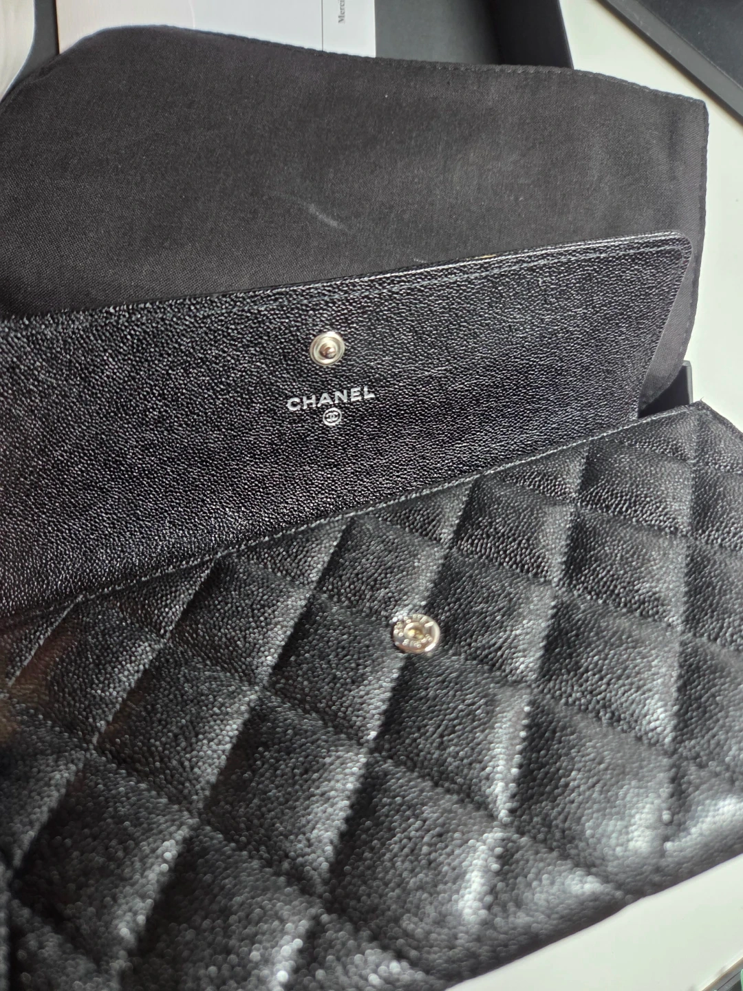 Authentic CHANEL wallet with classic quilted caviar black leather. Has multiple interior card slots and zippered closure inside. Made in France.
