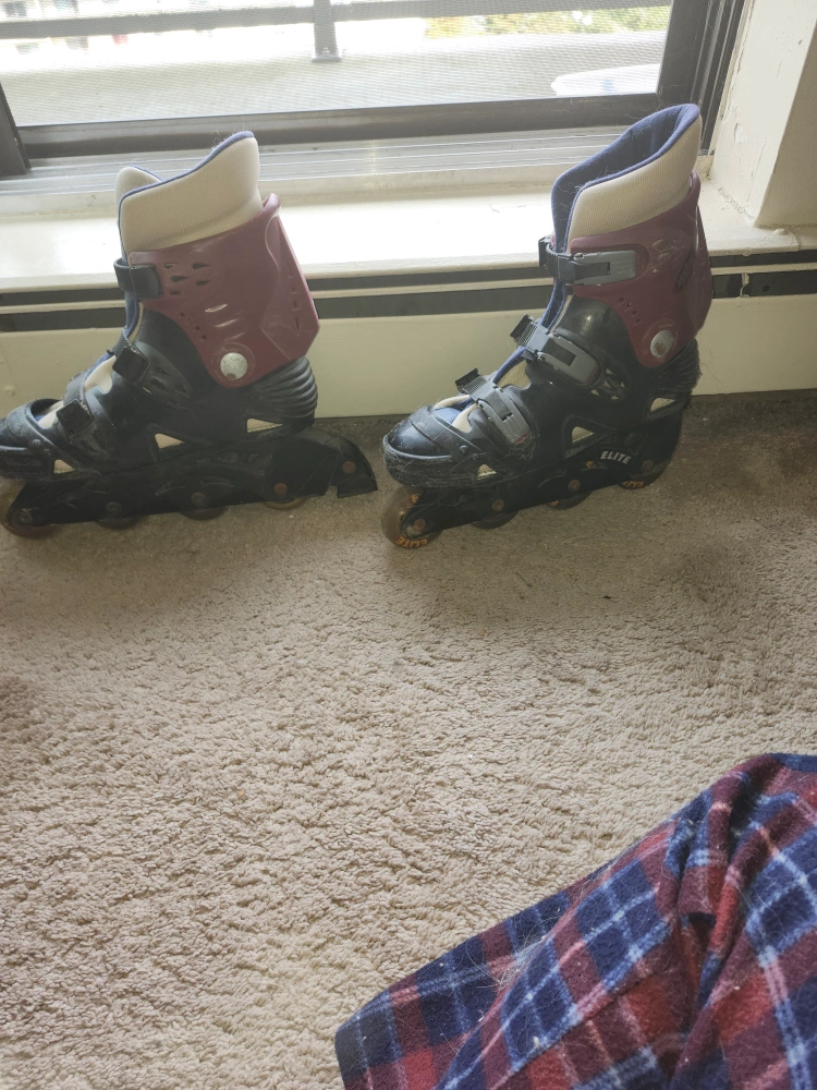 40Inline skates with black and burgundy accents. The skates are in good condition and have minimal wear and tear.