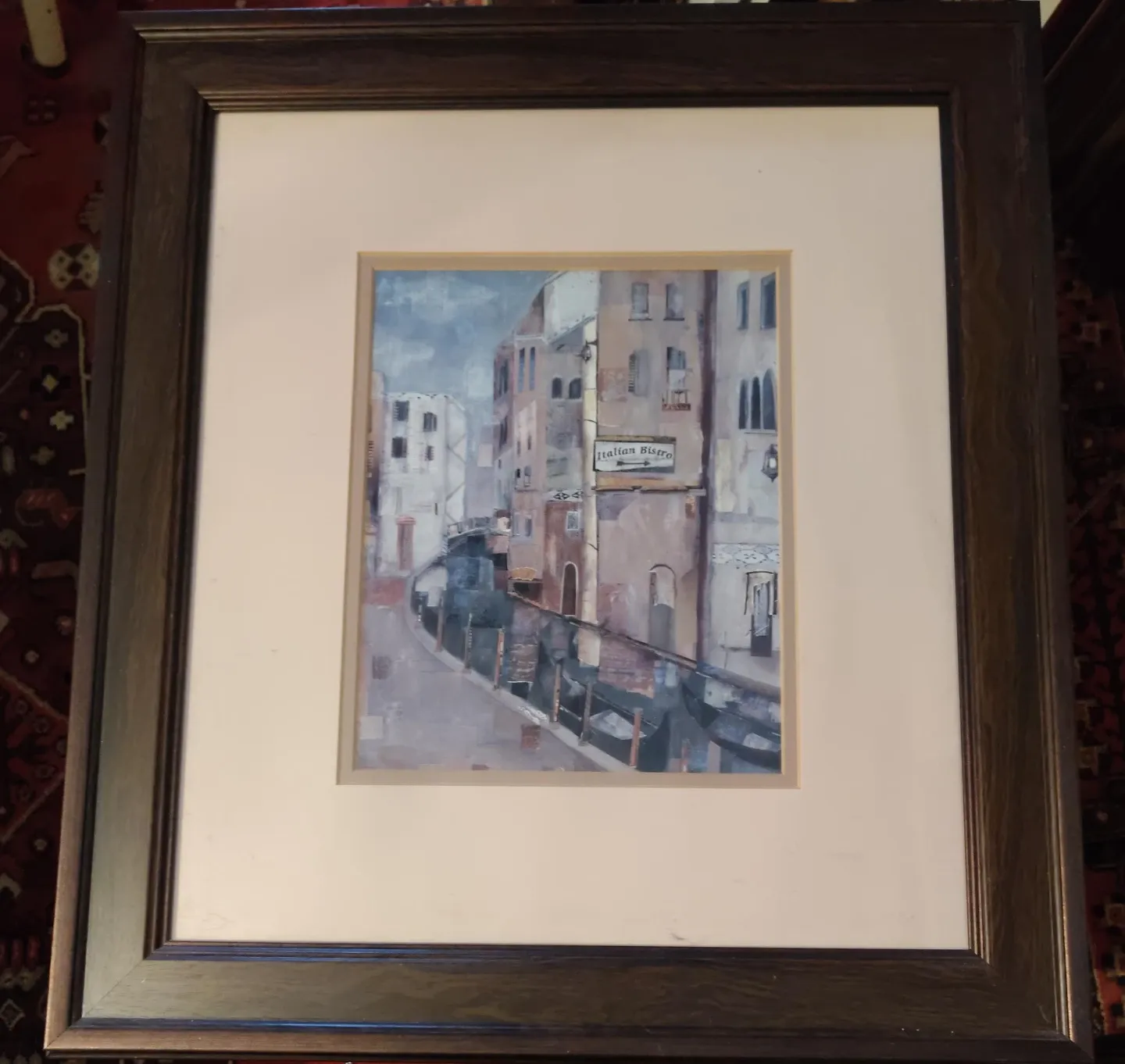This framed art print depicts a charming Italian street scene with buildings and a waterway. The artwork is framed in a dark wood frame and comes with a neutral mat. It's a lovely piece for adding character to any room.