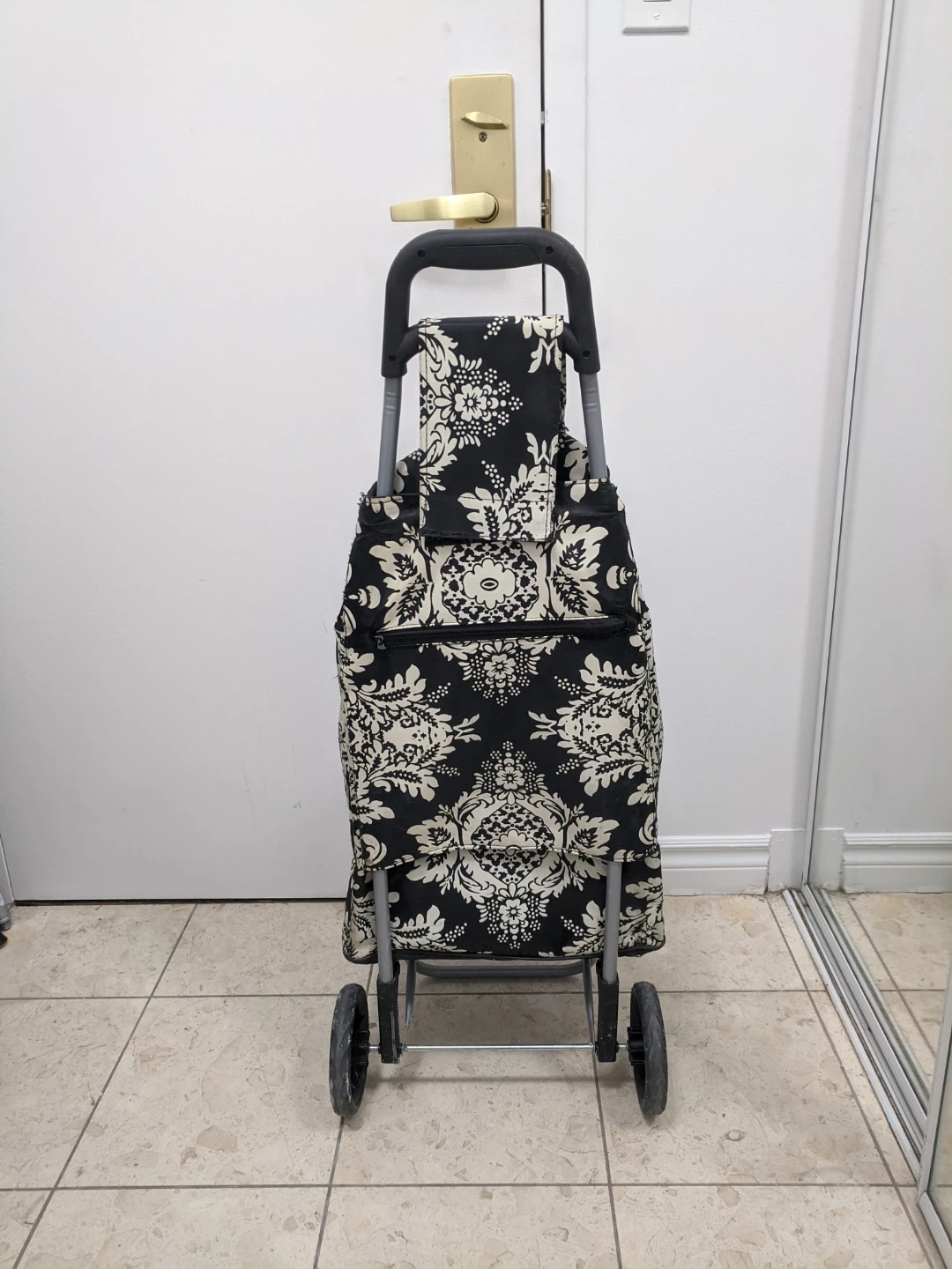 A black shopping trolley with a damask pattern. It has a large main compartment and a front zippered pocket. The trolley is lightweight and easy to manoeuvre. Used but Ok.