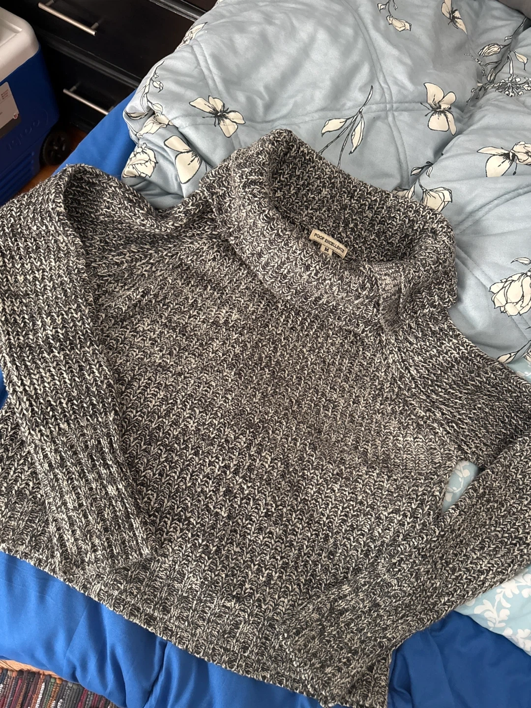 This is a POOF EXCELLENCE women's sweater in a size medium. It features a charcoal and white marled knit pattern with a cowl neckline. The material is a cozy knit, perfect for cooler weather.