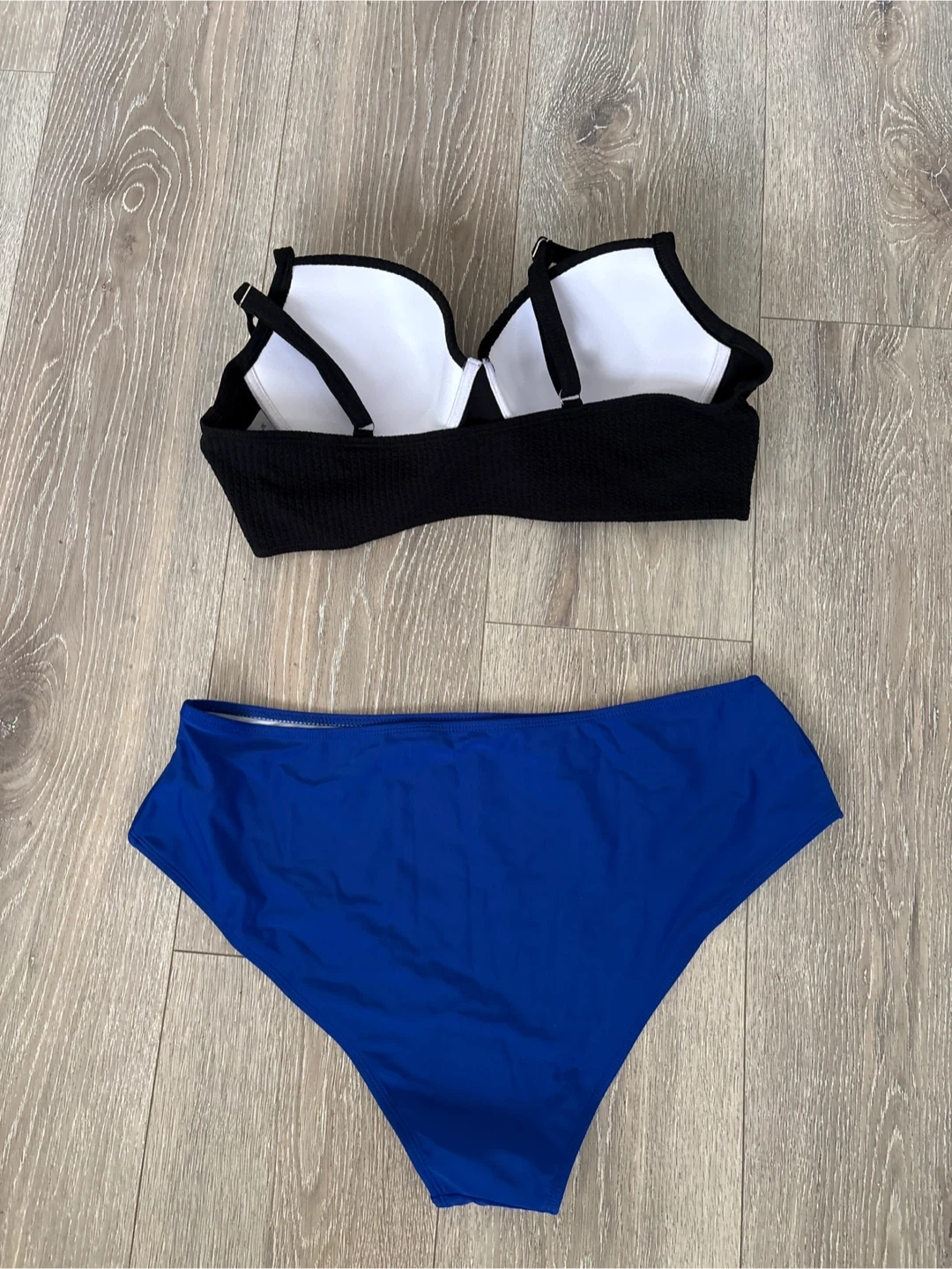 New Black Textured Bikini Top and Blue High-Waisted Bottoms Set