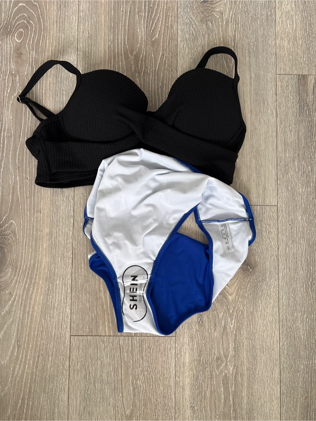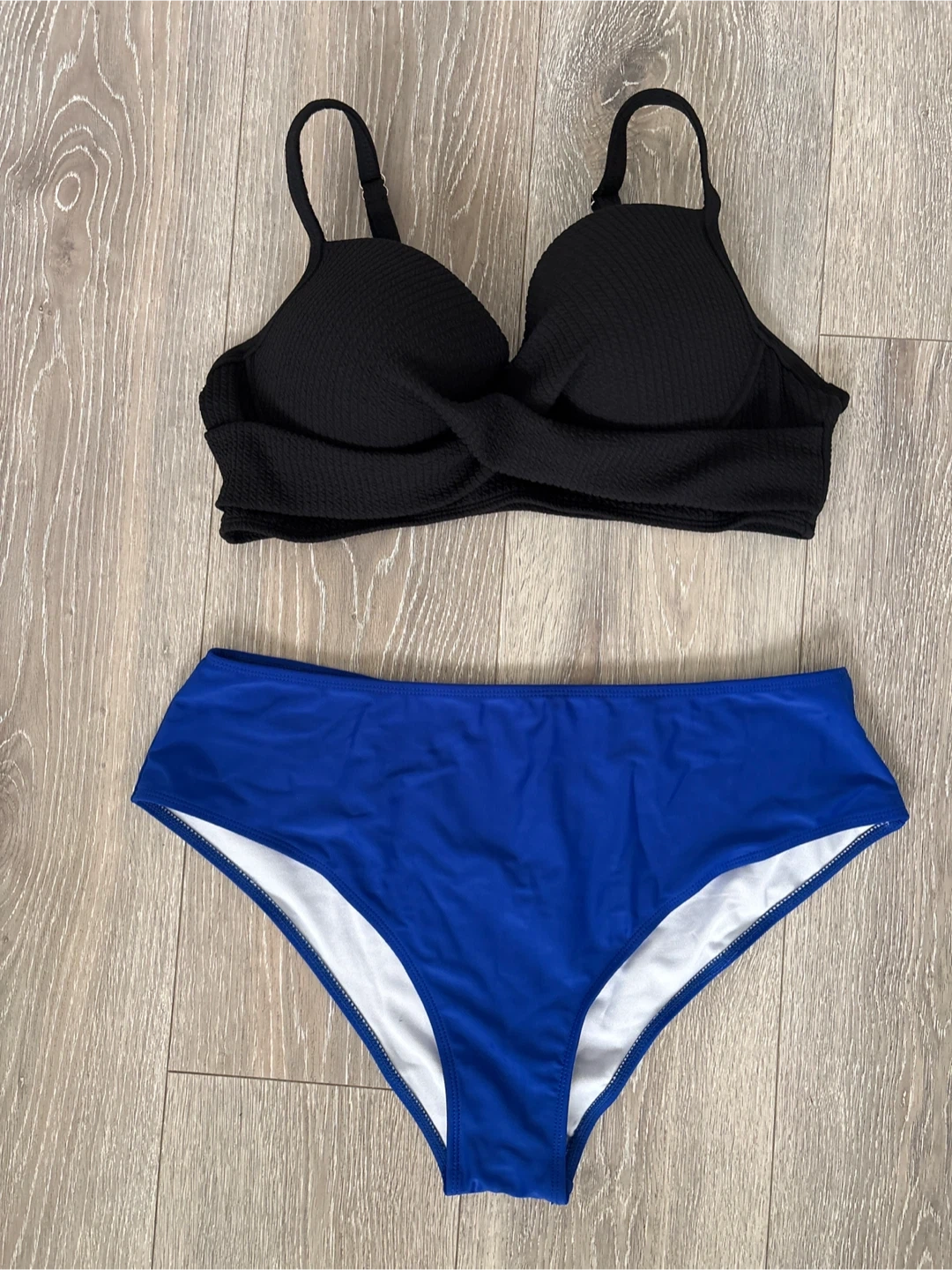 Brand New This is a two-piece swimsuit featuring a black textured bikini top and a vibrant blue high-waisted bottom. The top has adjustable straps and a twisted front detail. The bottoms offer full coverage. Nylon and spandex blend. Size 2 XL is like XL canadian size pick up walnut grove Langley