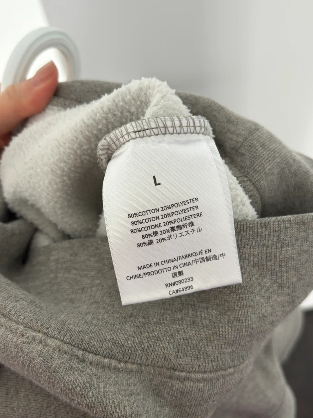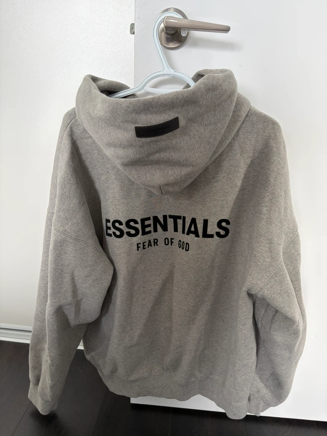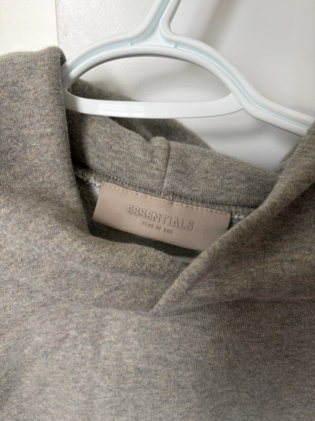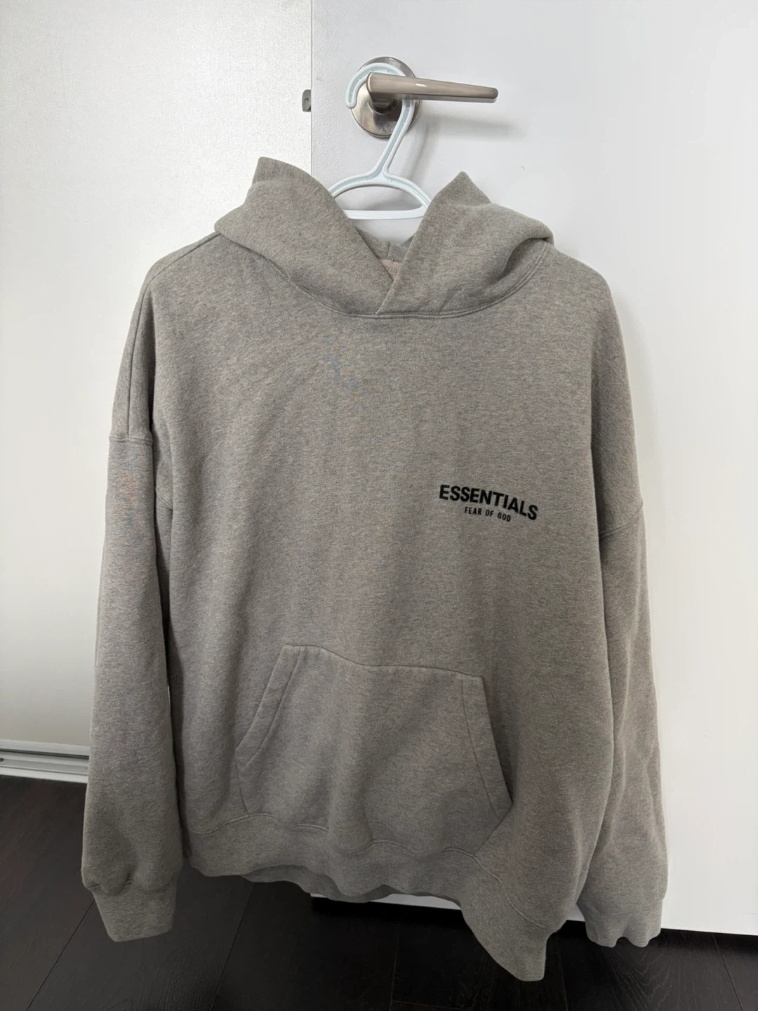 This is a grey Essentials hoodie. It's made of 80% cotton and 20% polyester. This hoodie has a front pouch pocket and a drawstring hood. It's a great casual piece for anyone's wardrobe.