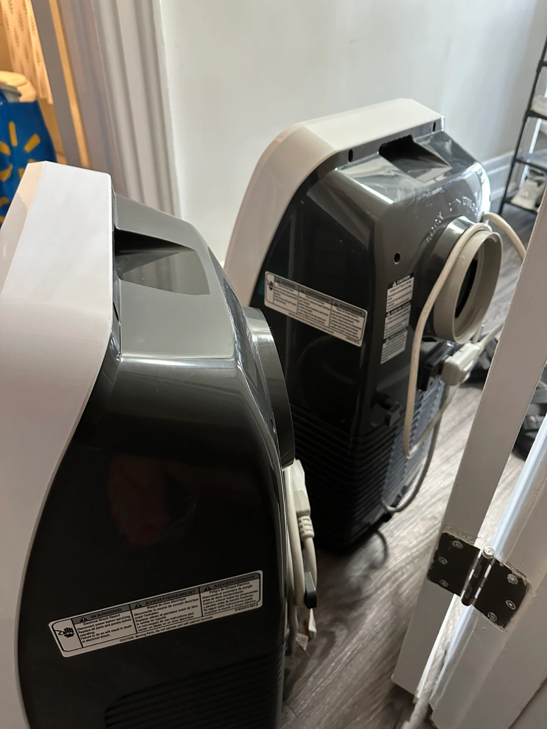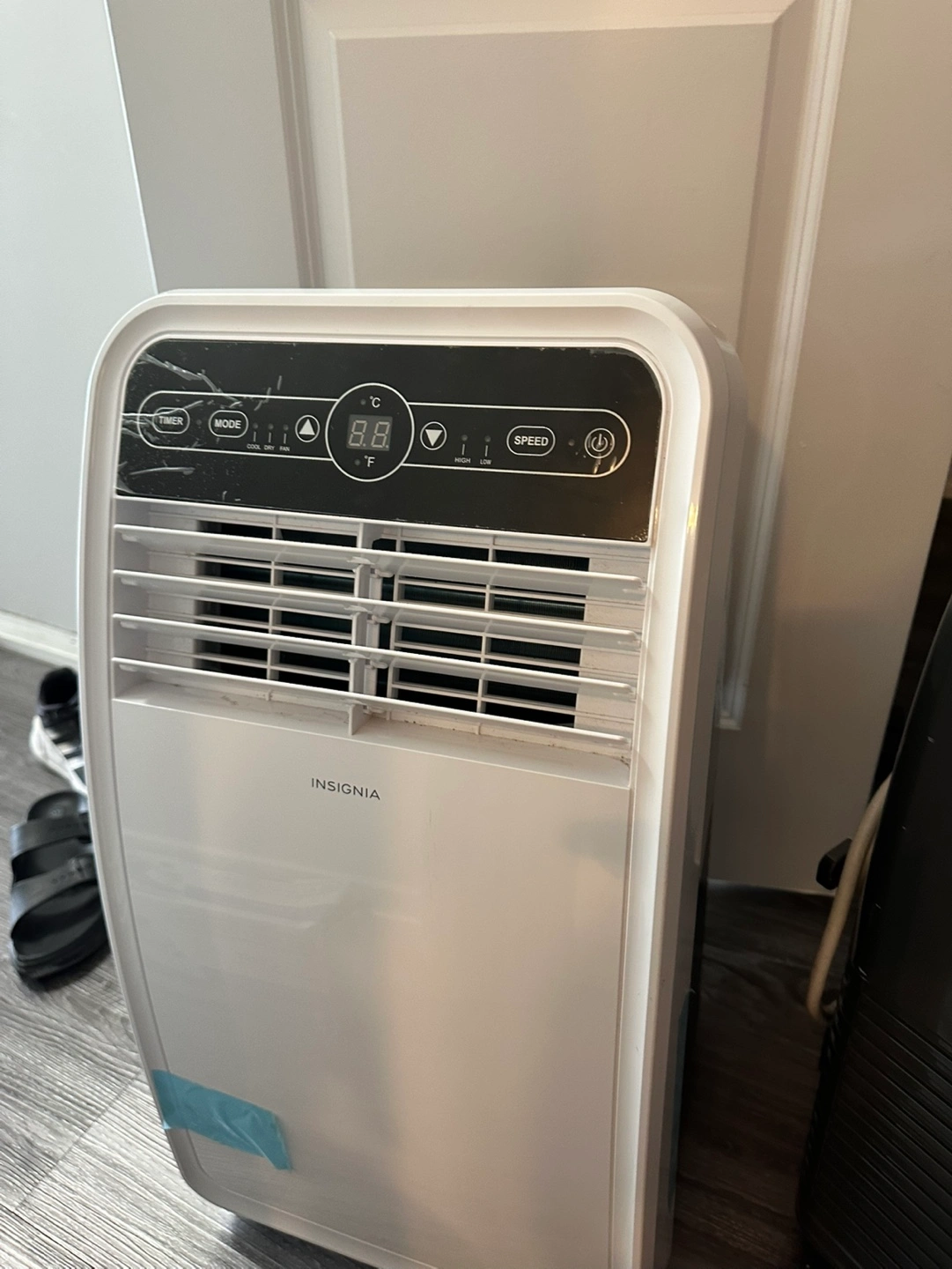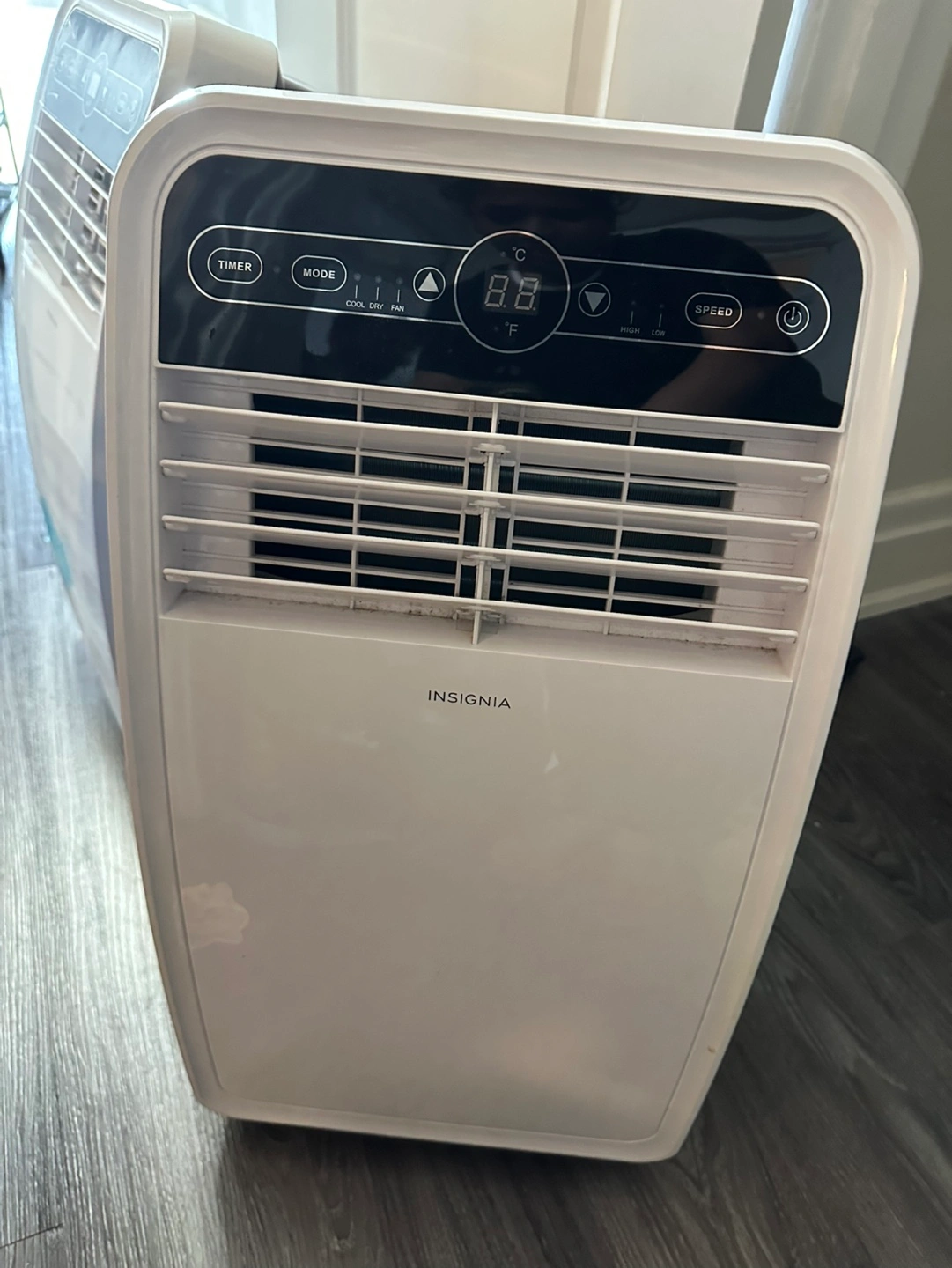 Portable air conditioner, cooling, fan, and dehumidifying functions. Digital controls, timer, and adjustable speed settings. Good for small spaces. https://www.bestbuy.com/site/insignia-350-sq-ft-portable-air-conditioner-white-gray/6145110.p?skuId=6145110
