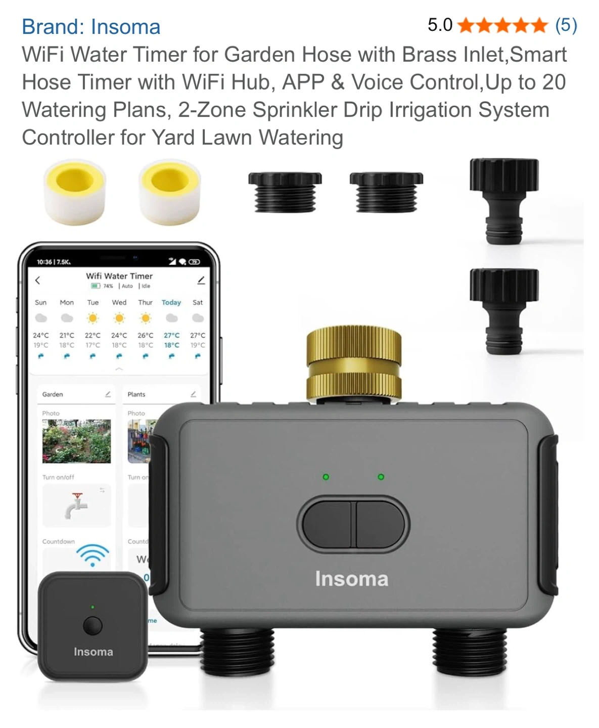 145This is an Insoma WiFi Water Timer for Garden Hose with Brass Inlet. It's a smart hose timer with WiFi Hub, APP & Voice Control, and can handle up to 20 Watering Plans. It's also a 2-Zone Sprinkler Drip Irrigation System Controller for Yard Lawn Watering. It has a rain delay setting to save water!