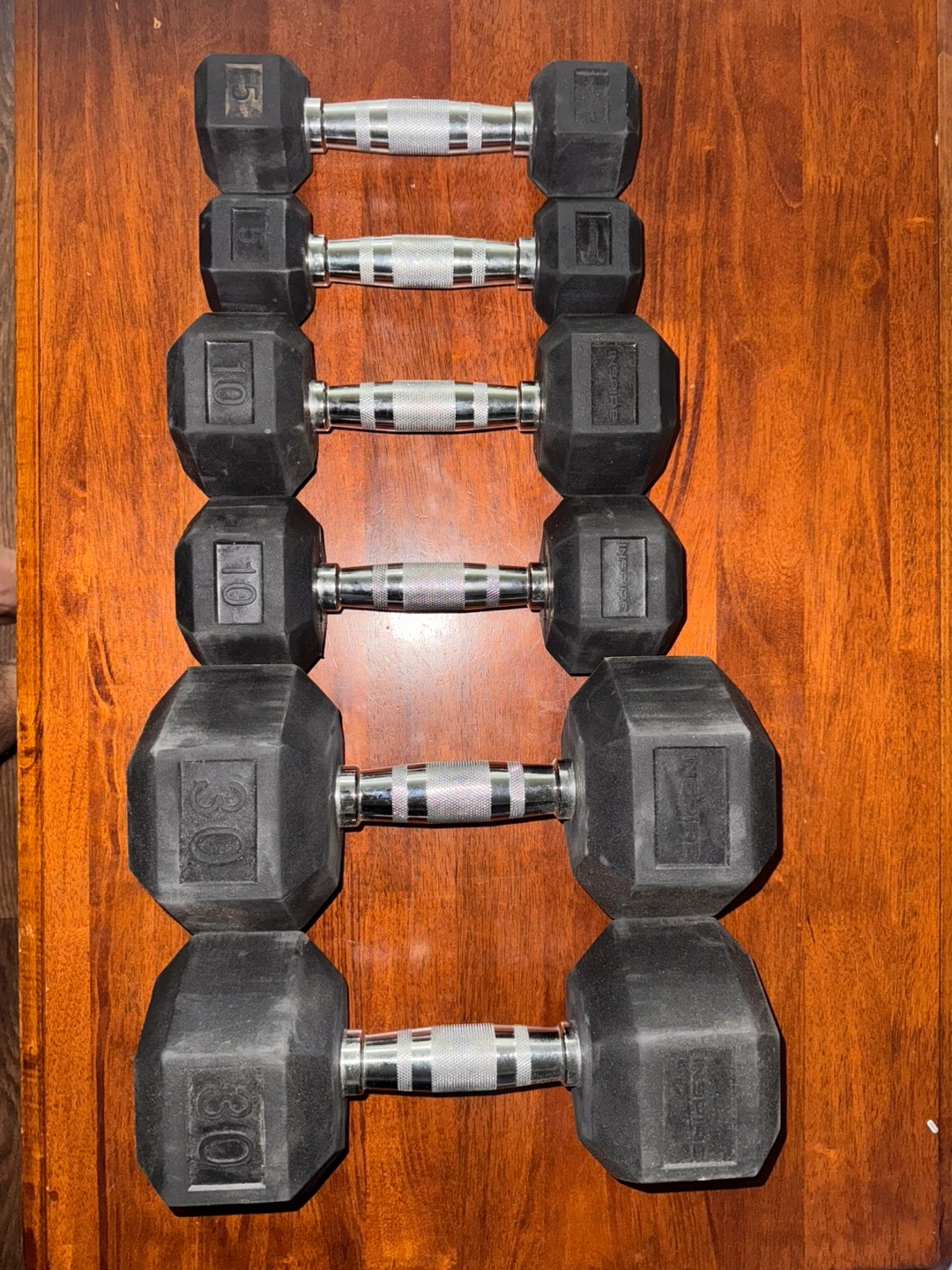 Selling a set of Inspire Fitness dumbbells! Includes pairs of 5 lb, 10 lb, 20 lb, and 30 lb weights. They're in great shape and ready for your home gym