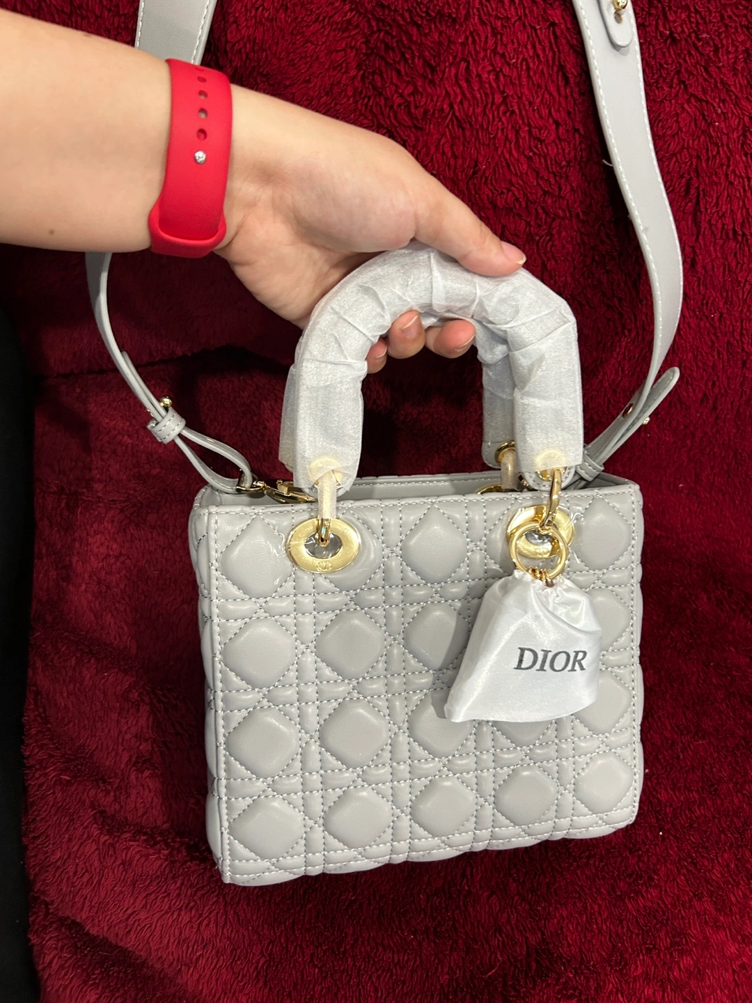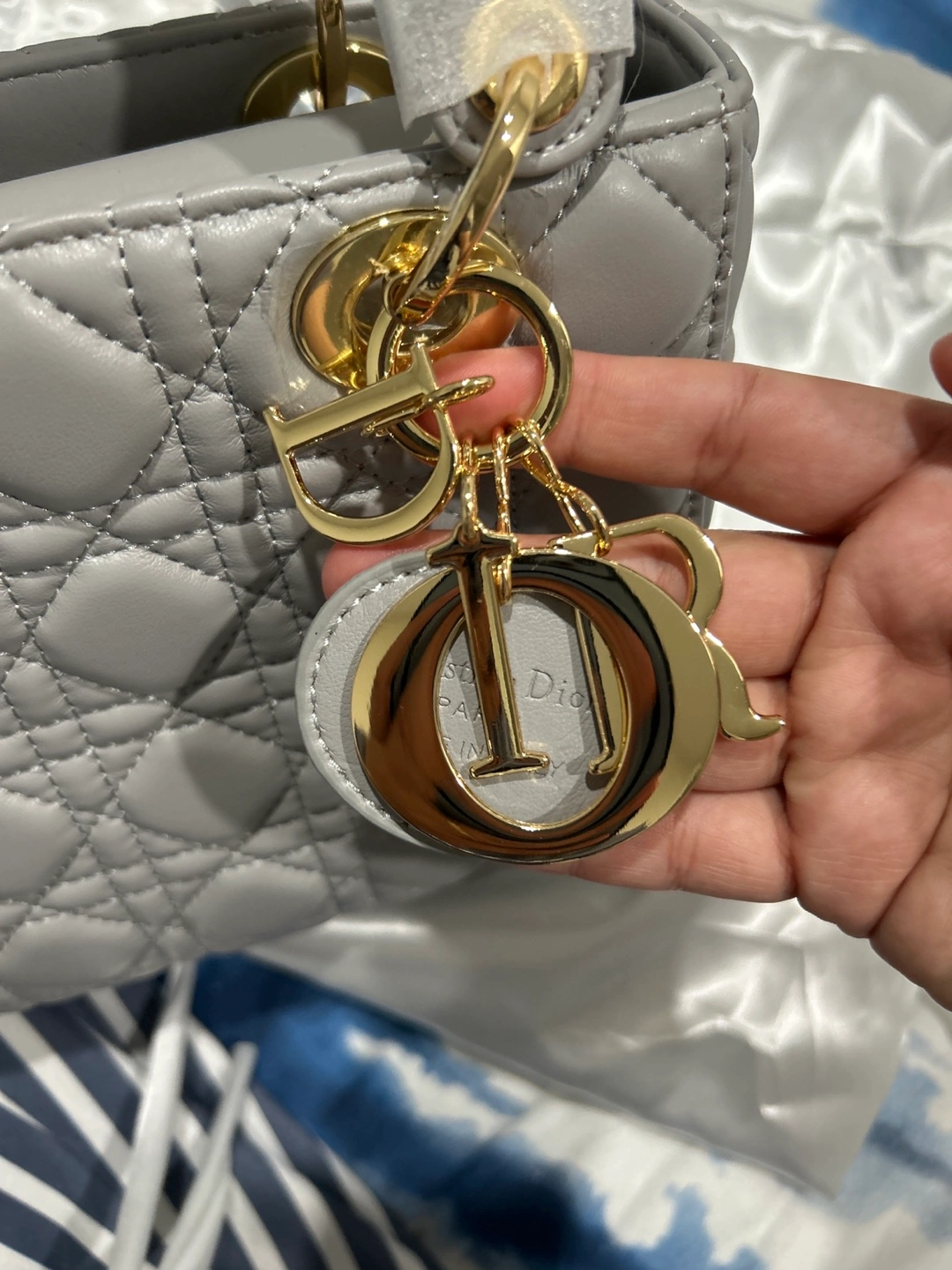 Inspired Light grey quilted leather. Gold-toned hardware. Top handles and shoulder strap. Dust bag included.