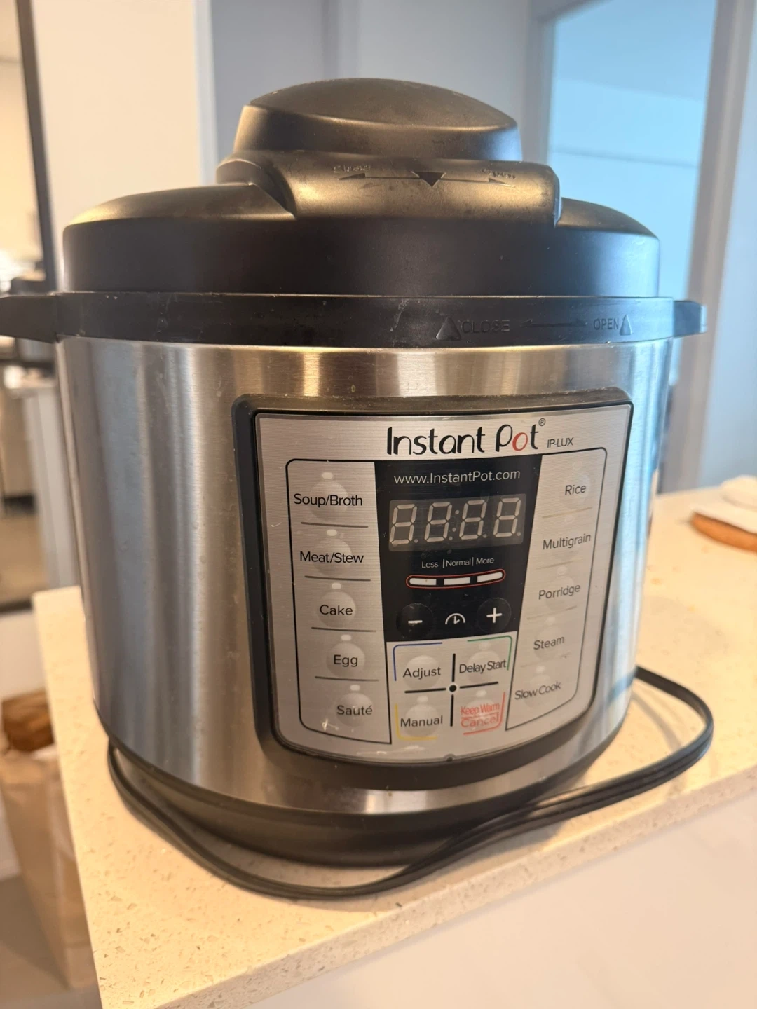 Selling an Instant Pot 8 Quart 6-in-1 Multi-Use Electric Pressure Cooker. It has settings for soup/broth, meat/stew, cake, egg, sauté, manual, rice, multigrain, porridge, steam, and slow cook. It's in great shape.