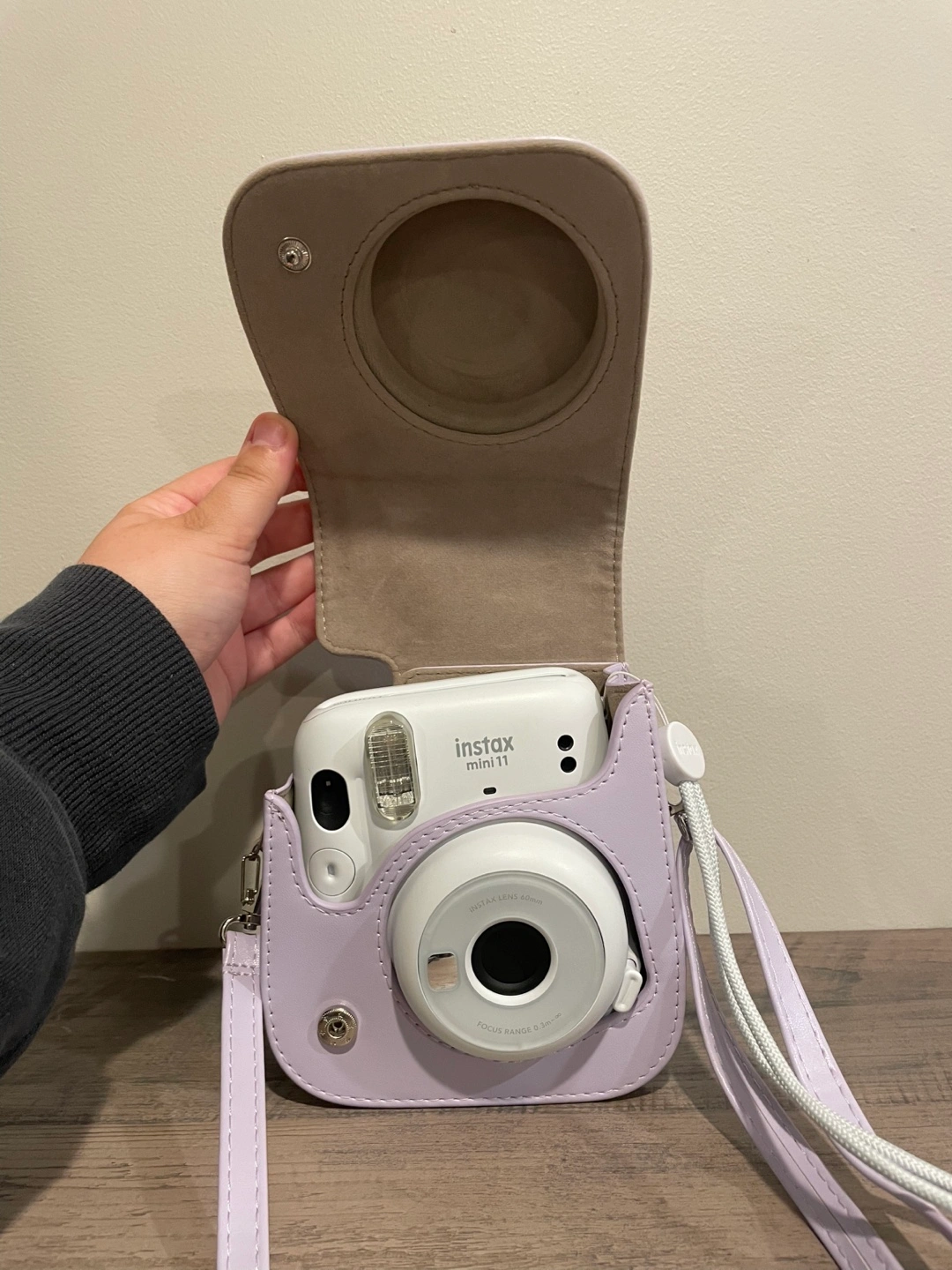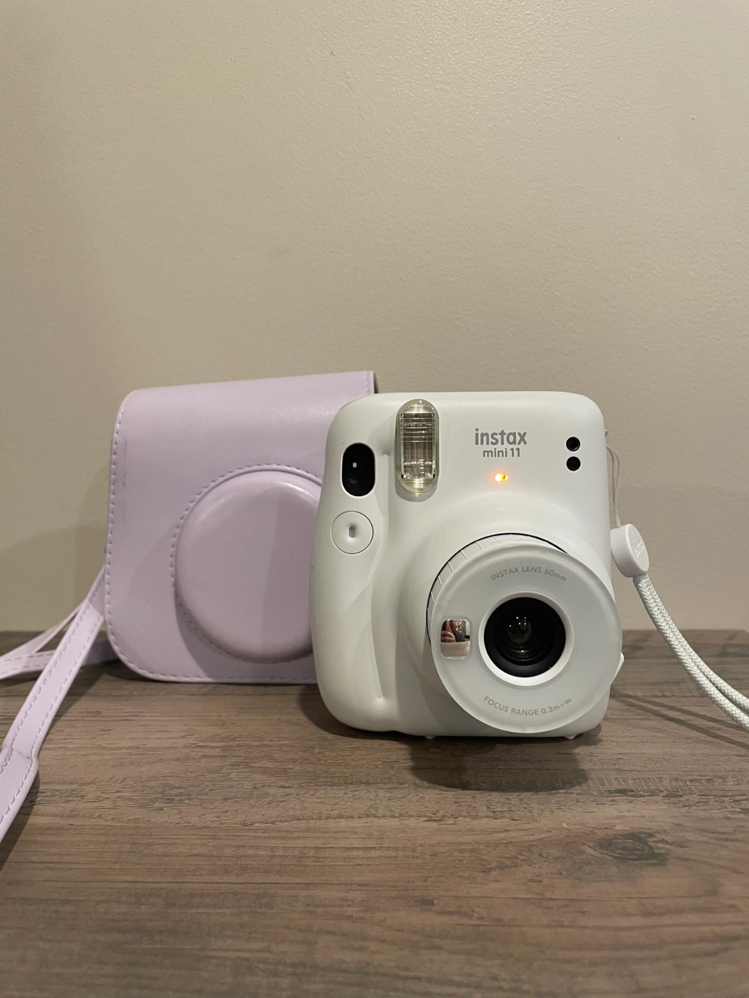 15White Instax Mini 11 instant camera in great condition. Includes a lavender carrying case. Compact and portable. Great for capturing memories. Light is on in the photo because there is no cartridge inside. No damage/ issues!