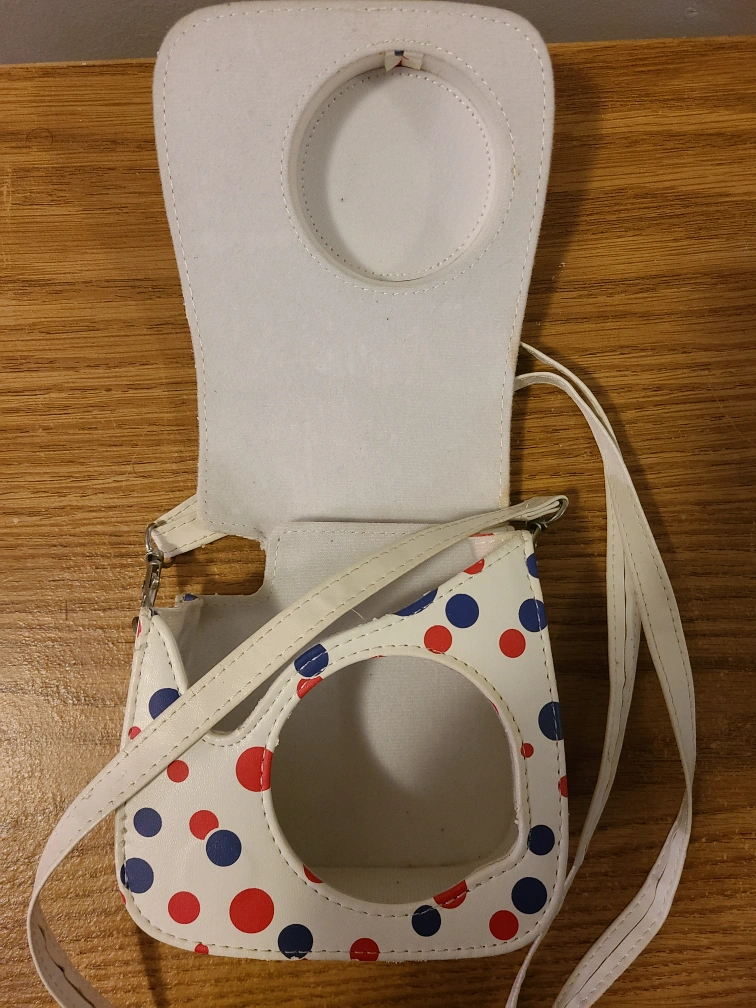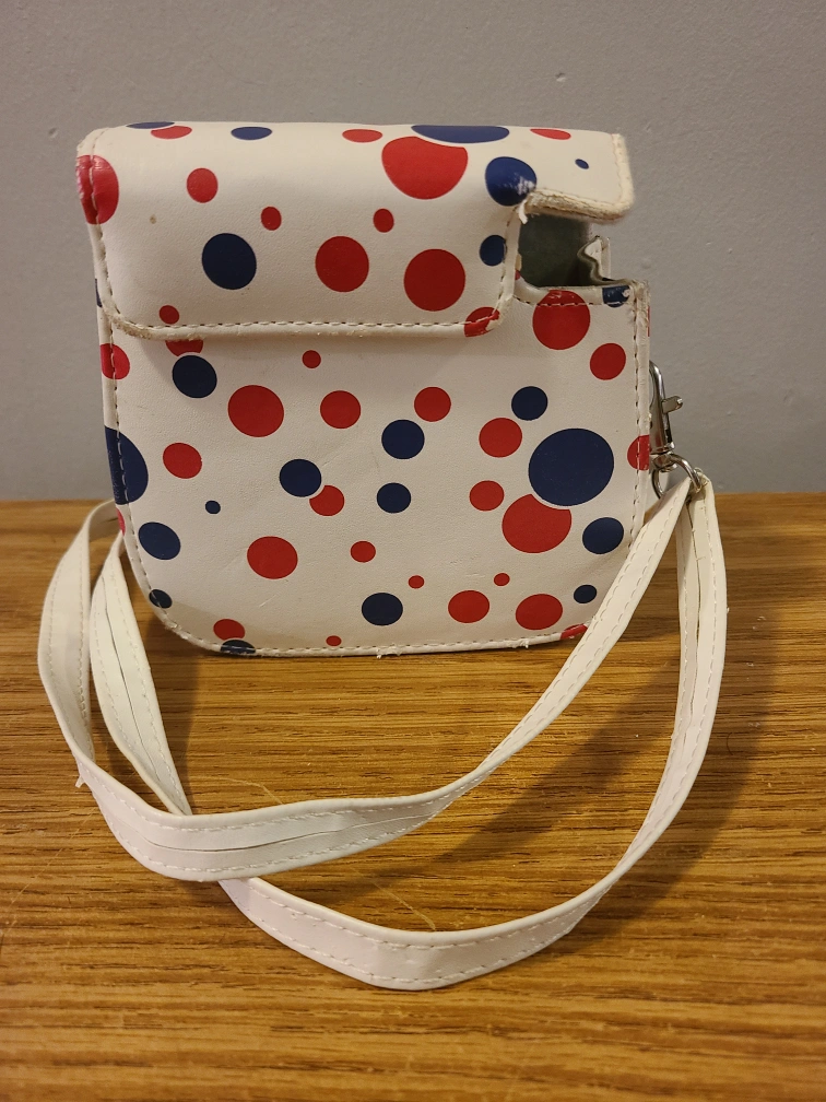 357Cute Instax mini camera case. Polka dot design. Red and blue dots on white background. Adjustable shoulder strap.
