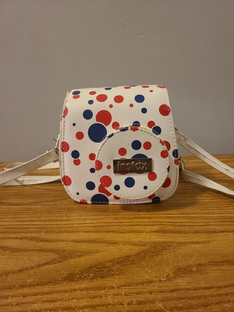 357Cute Instax mini camera case. Polka dot design. Red and blue dots on white background. Adjustable shoulder strap.