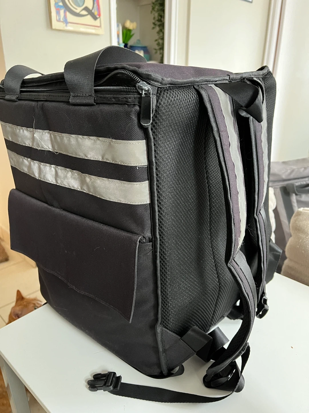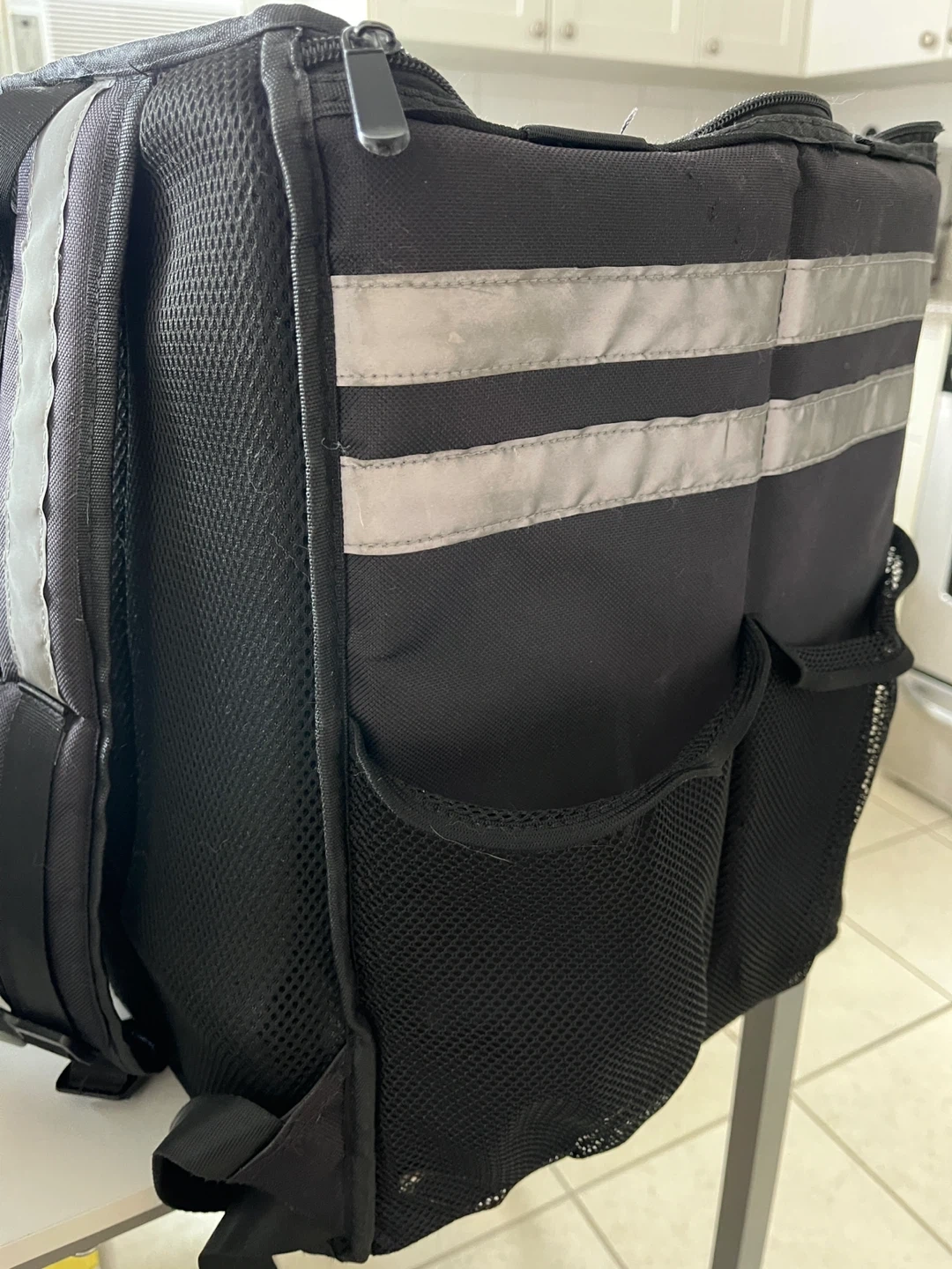 126Selling a used insulated food delivery backpack. It's in good condition and perfect for keeping food hot or cold on the go! The backpack is black and features reflective stripes for visibility.