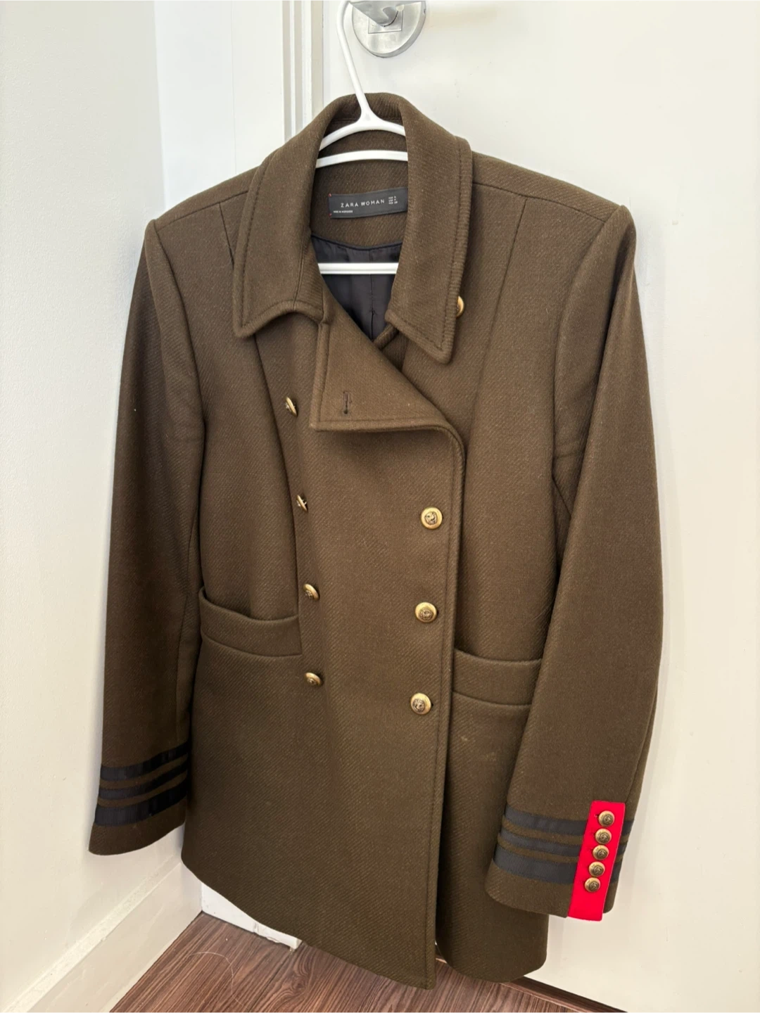 This ZARA WOMAN jacket features a stylish military-inspired design with gold-tone buttons and decorative ribbon detailing on the cuffs. It's a double-breasted style in a dark olive green colour. Made from a wool blend.