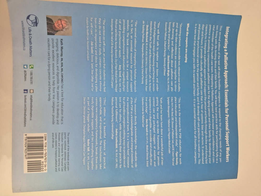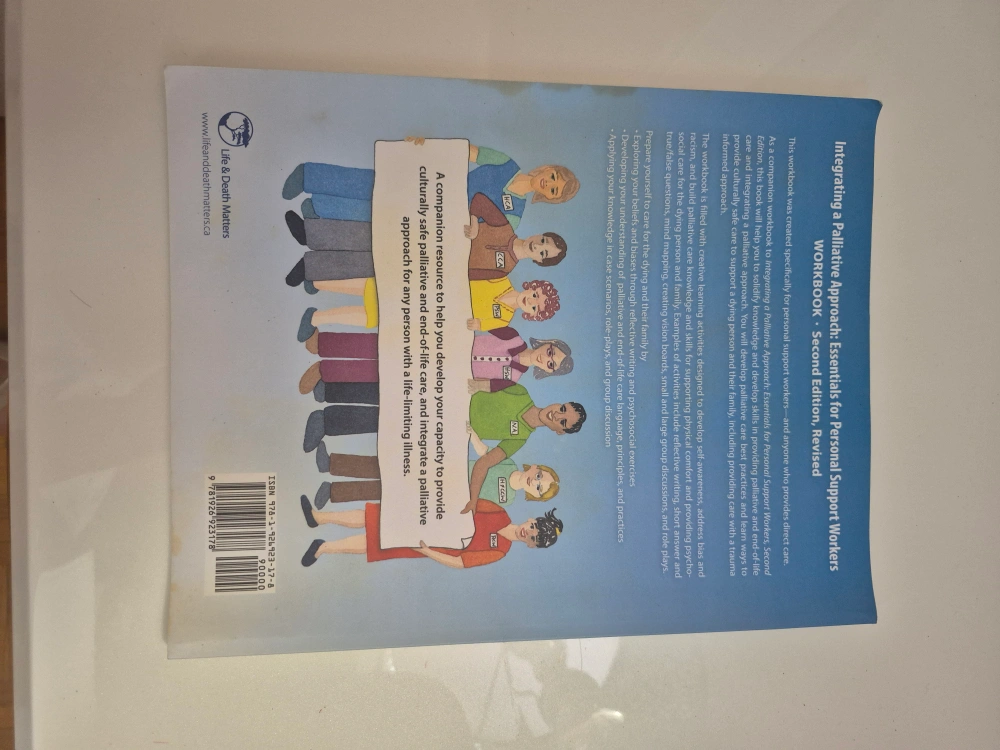 I'm selling a workbook called 'Integrating a Palliative Approach: Essentials for Personal Support Workers.' It's the Second Edition, Revised version. This workbook is designed specifically for personal support workers and anyone who provides direct care. It will help you to identify and respond to the changing needs of people living with life-limiting illness and their family.