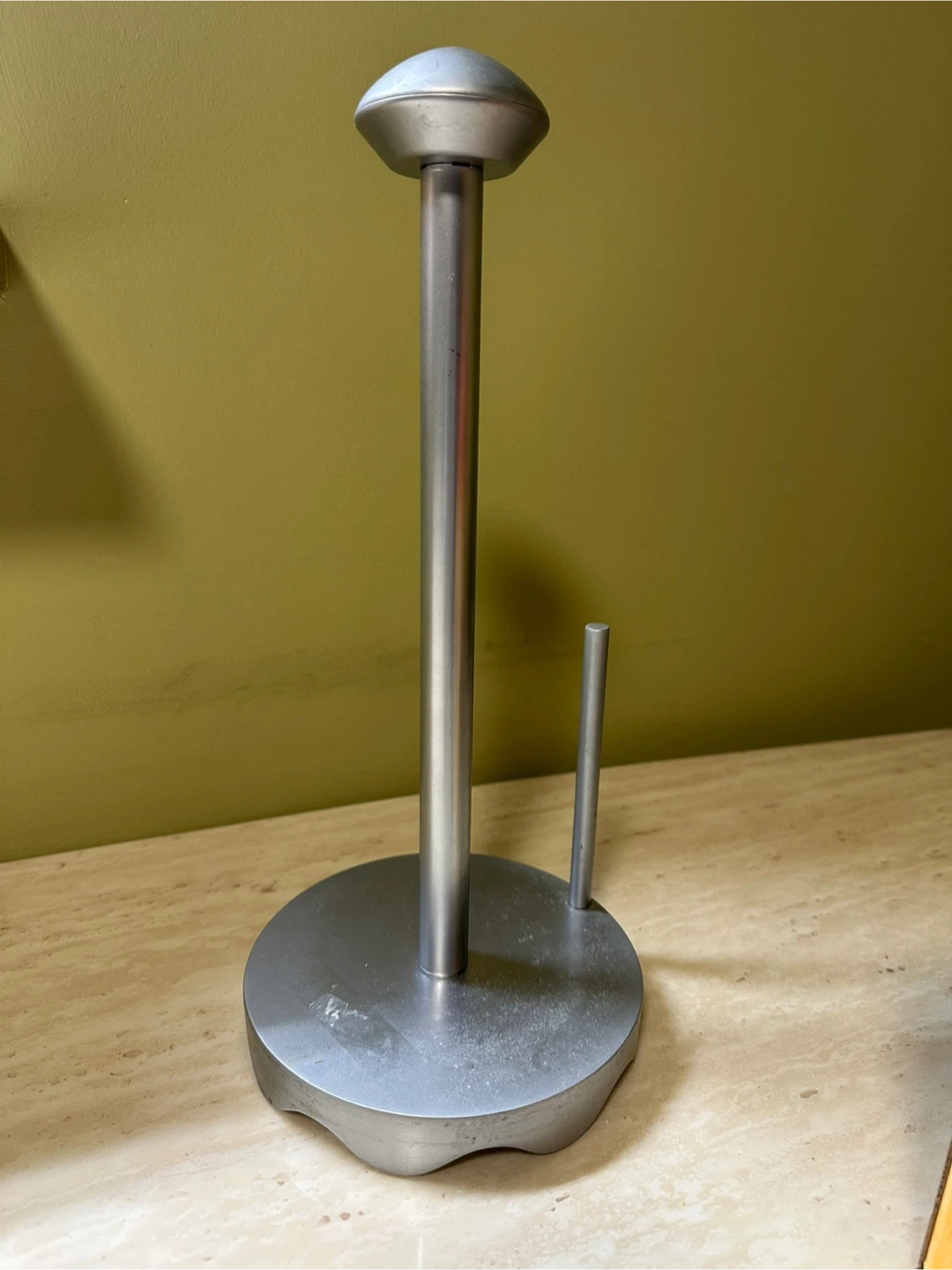 59Keep your kitchen tidy with this InterDesign paper towel holder! It has a sleek satin finish and a sturdy base. Originally bought for $30.98 from Ming Wo It can hold regular to extra large paper towel rolls. Good sturdy quality, not the poor quality from dollar stores