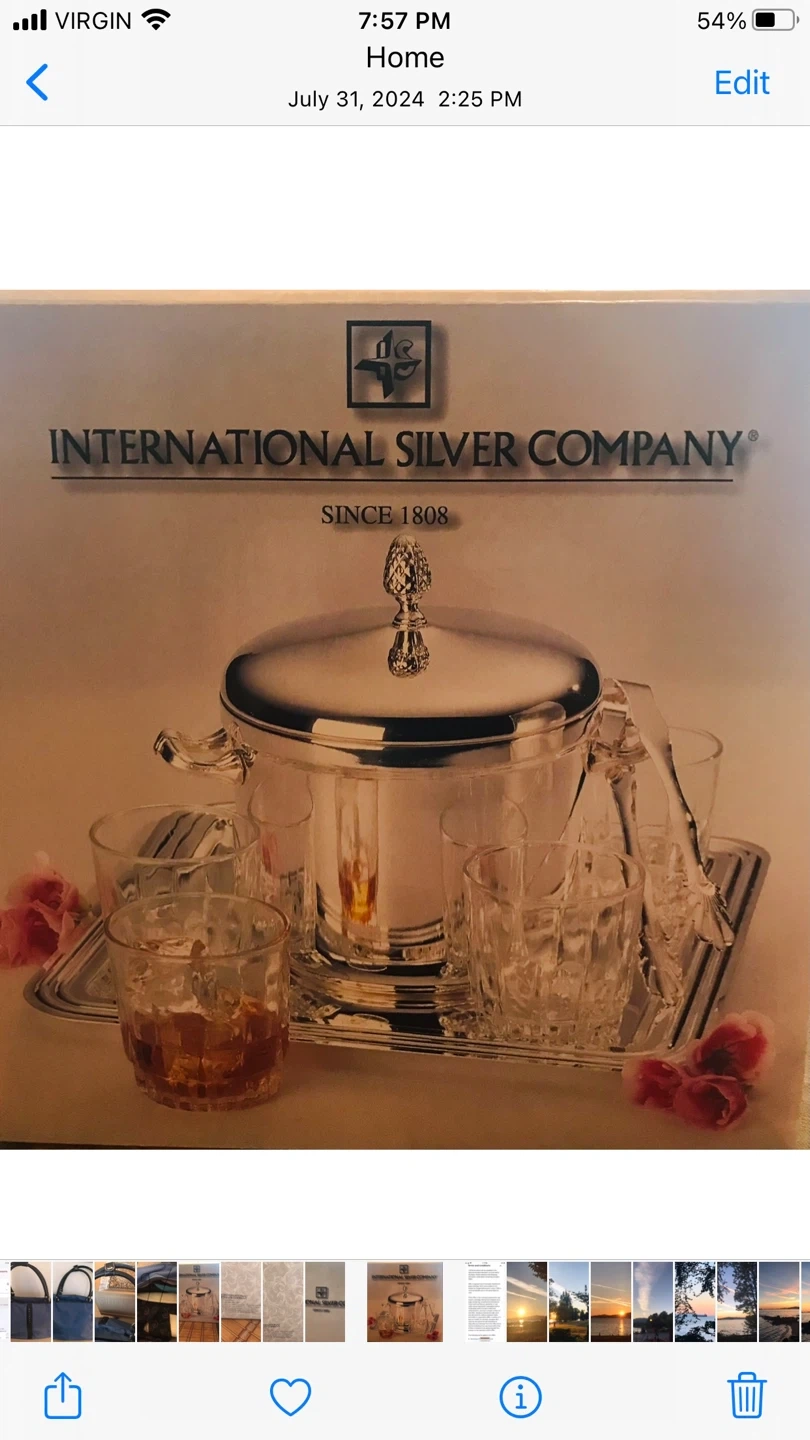 15Selling an International Silver Company ice bucket set! It comes complete with the ice bucket, 4 whisky glasses, a serving tray, and ice tongs. The box is included as well. This has never been used .