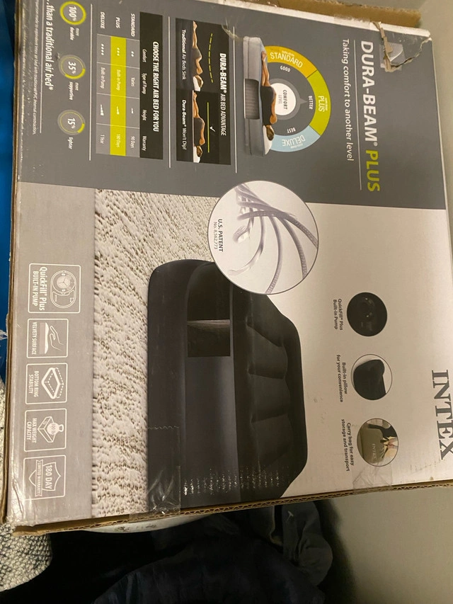 146Get ready for a restful night with this Intex Dura-Beam Plus airbed, designed for enhanced comfort and support! This used airbed features a built-in pump for quick and easy inflation, as well as a built-in pillow for added convenience. The velvety surface ensures a cozy sleep experience. Note that it's in used condition. Specifications: * Brand: Intex * Model: Dura-Beam Plus * Built-in QuickFill Plus Pump * Built-in Pillow * Velvety Surface