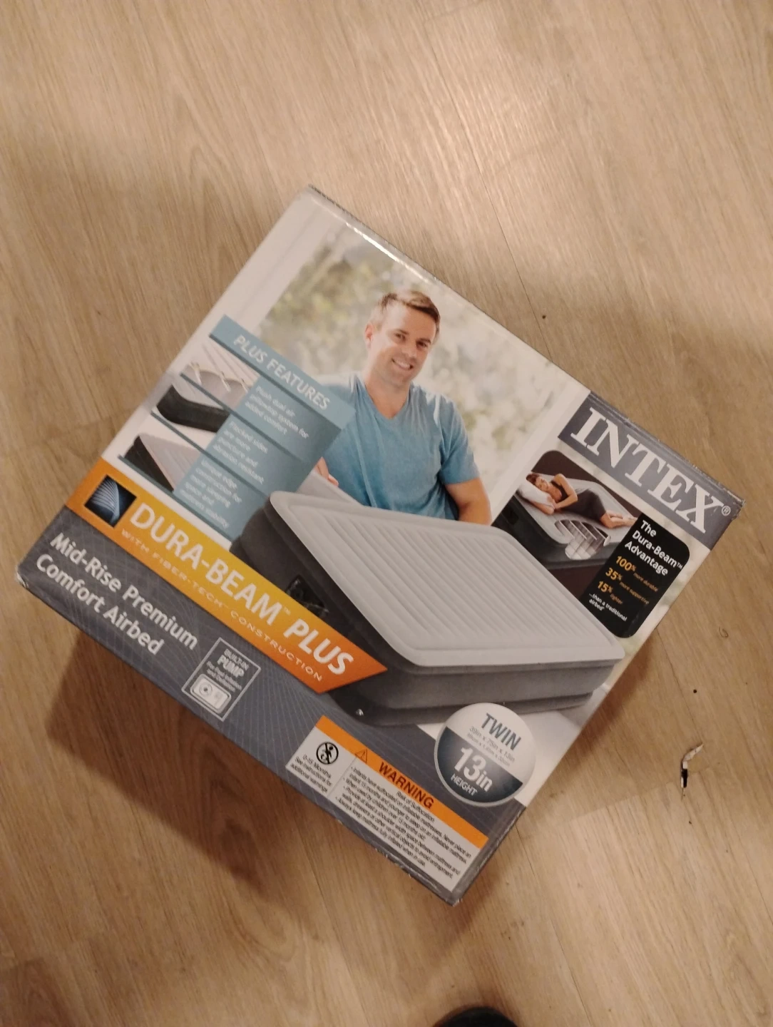 68Selling an Intex Dura-Beam Plus Mid-Rise Premium Comfort Airbed! It features Fiber-Tech construction and a built-in pump. The airbed is a twin size, measuring 39in x 75in with a height of 13in. It also has flocked sides for more puncture and abrasion resistance.