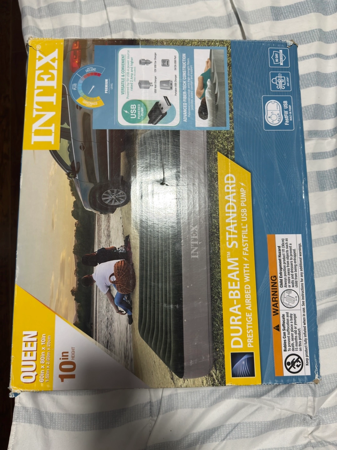 20Selling a brand new Intex Dura-Beam Standard Queen air mattress, still in the original box! It's queen size, measuring 60in x 80in x 10in. It features a built-in USB pump for easy inflation and deflation. Perfect for guests or camping! Negotiable!