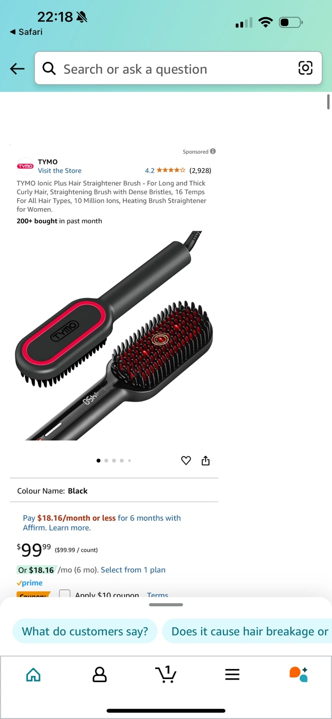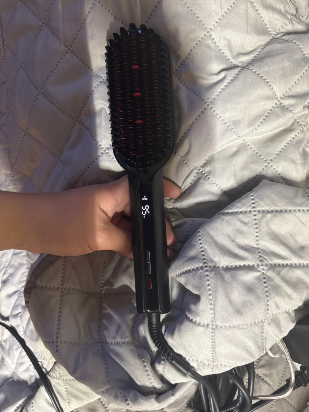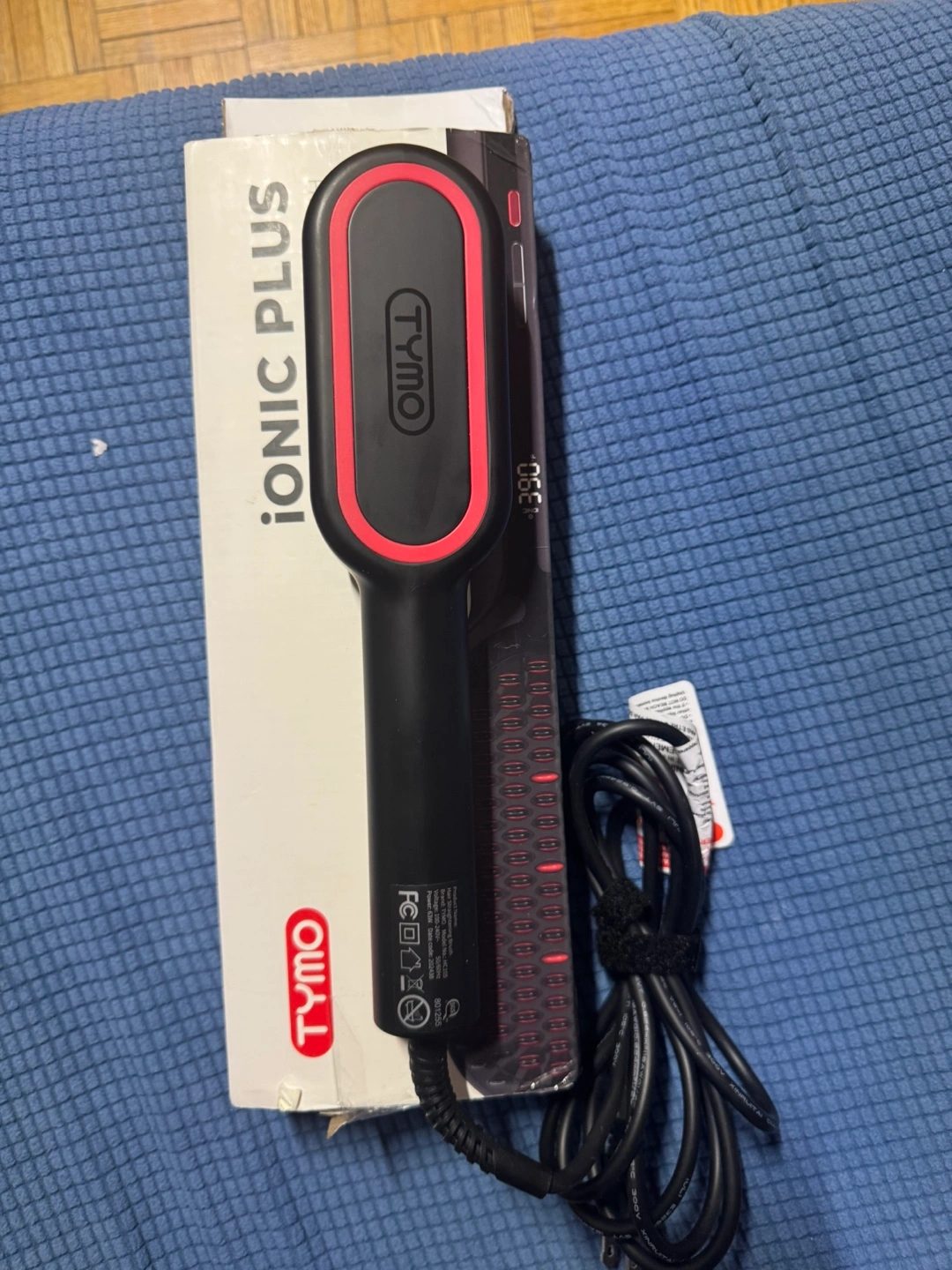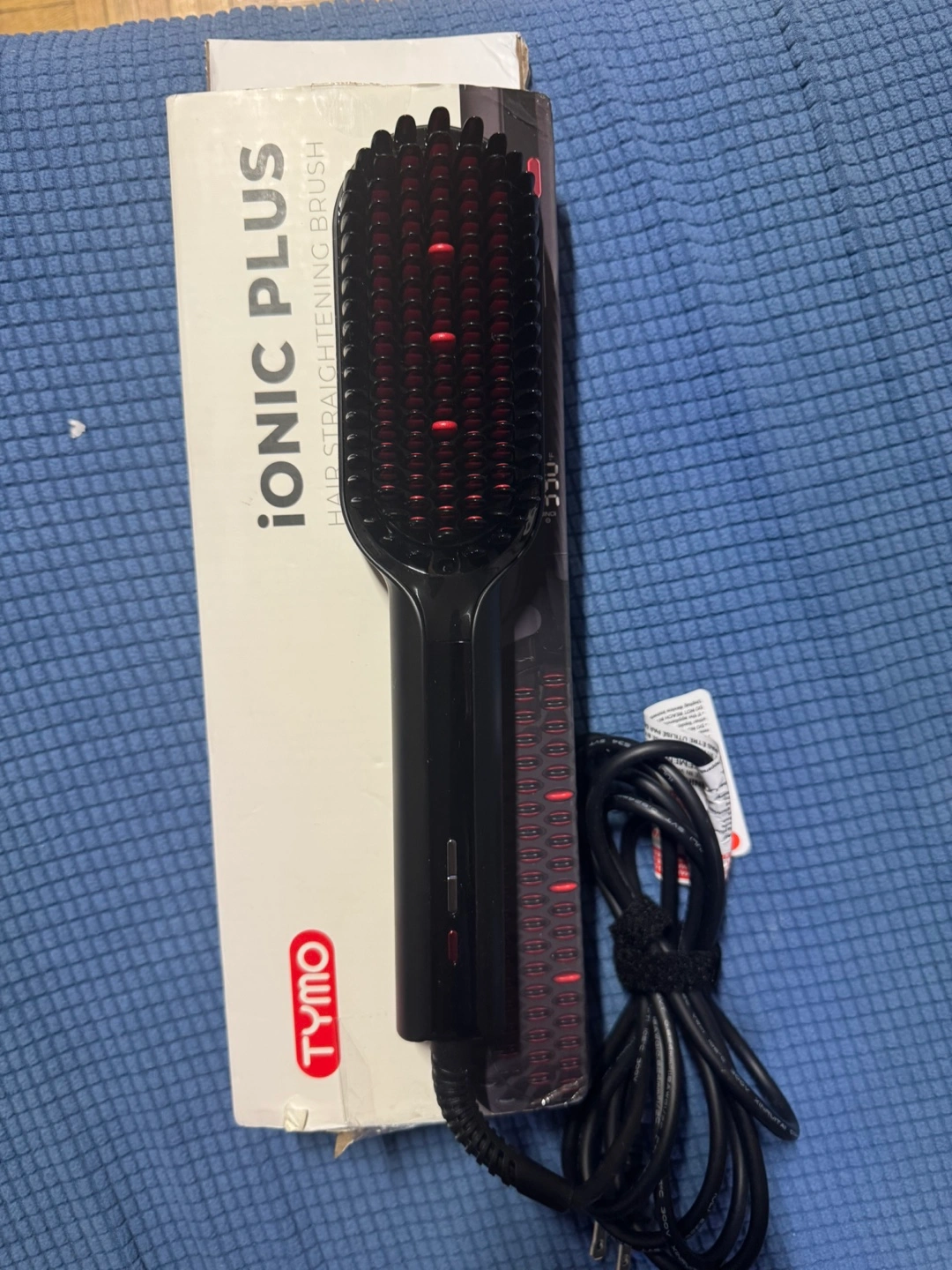 Black TYMO Ionic Plus hair straightening brush. Features adjustable temperature settings. Gently straightens hair. Includes power cord.
