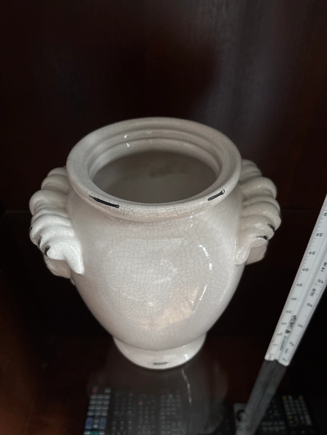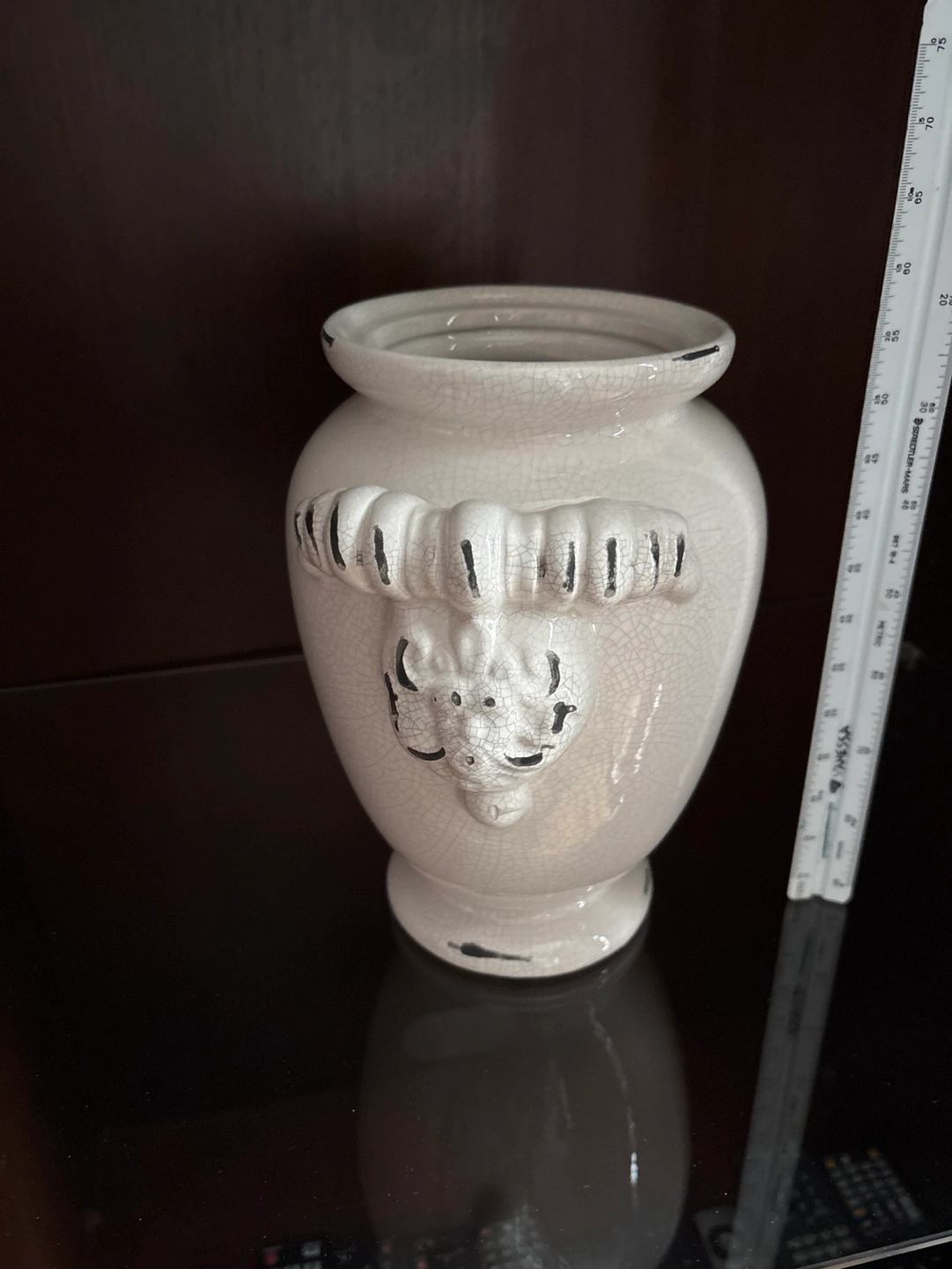 Elegant off-white ceramic vase. Features a unique ram's head design and crackle glaze finish. Perfect for home decor or floral arrangements. Measures approximately 10 inches tall.