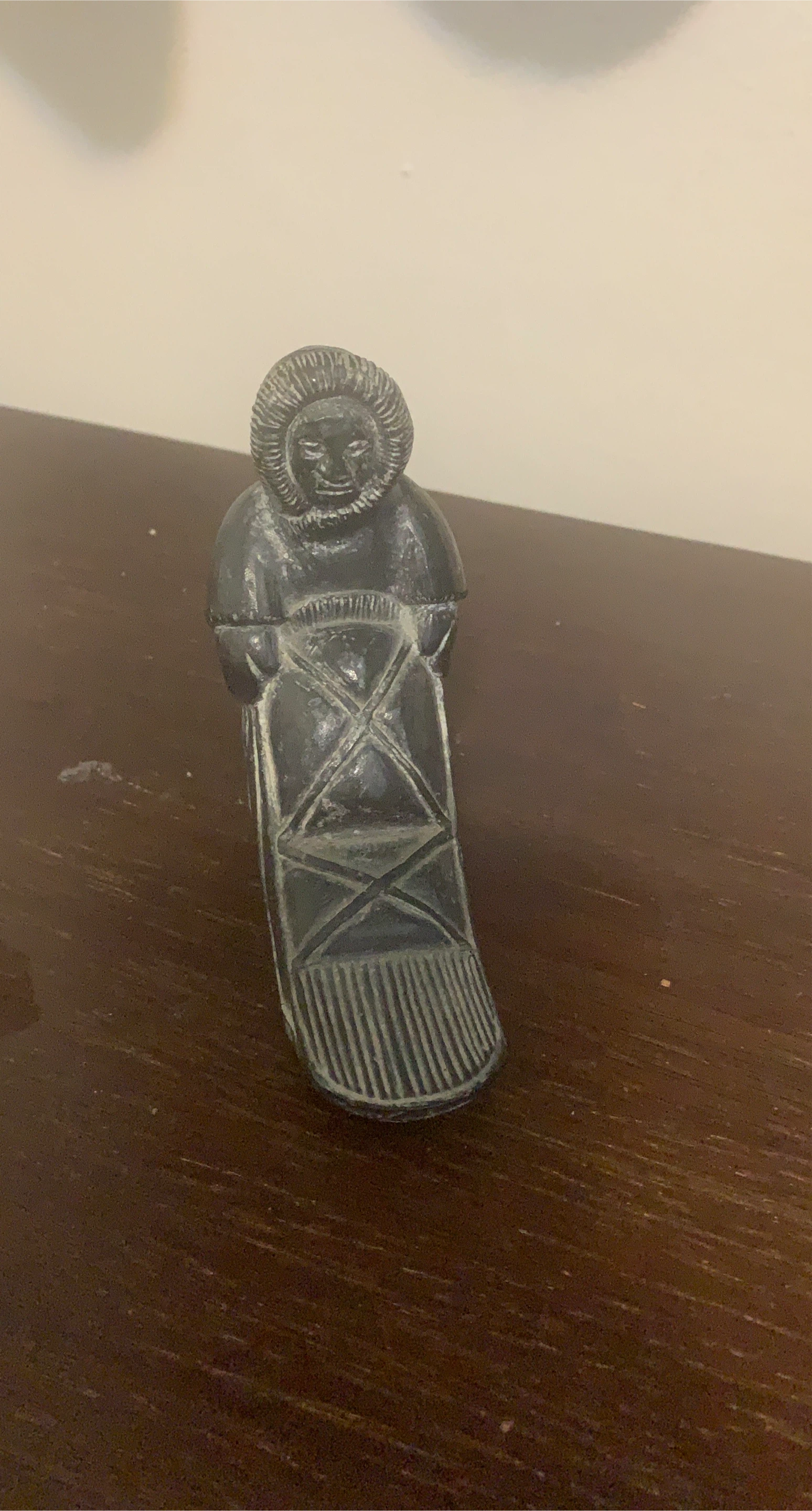 46This is a hand-carved Inuit figurine made of stone. It depicts a person holding a drum. A unique piece of art!