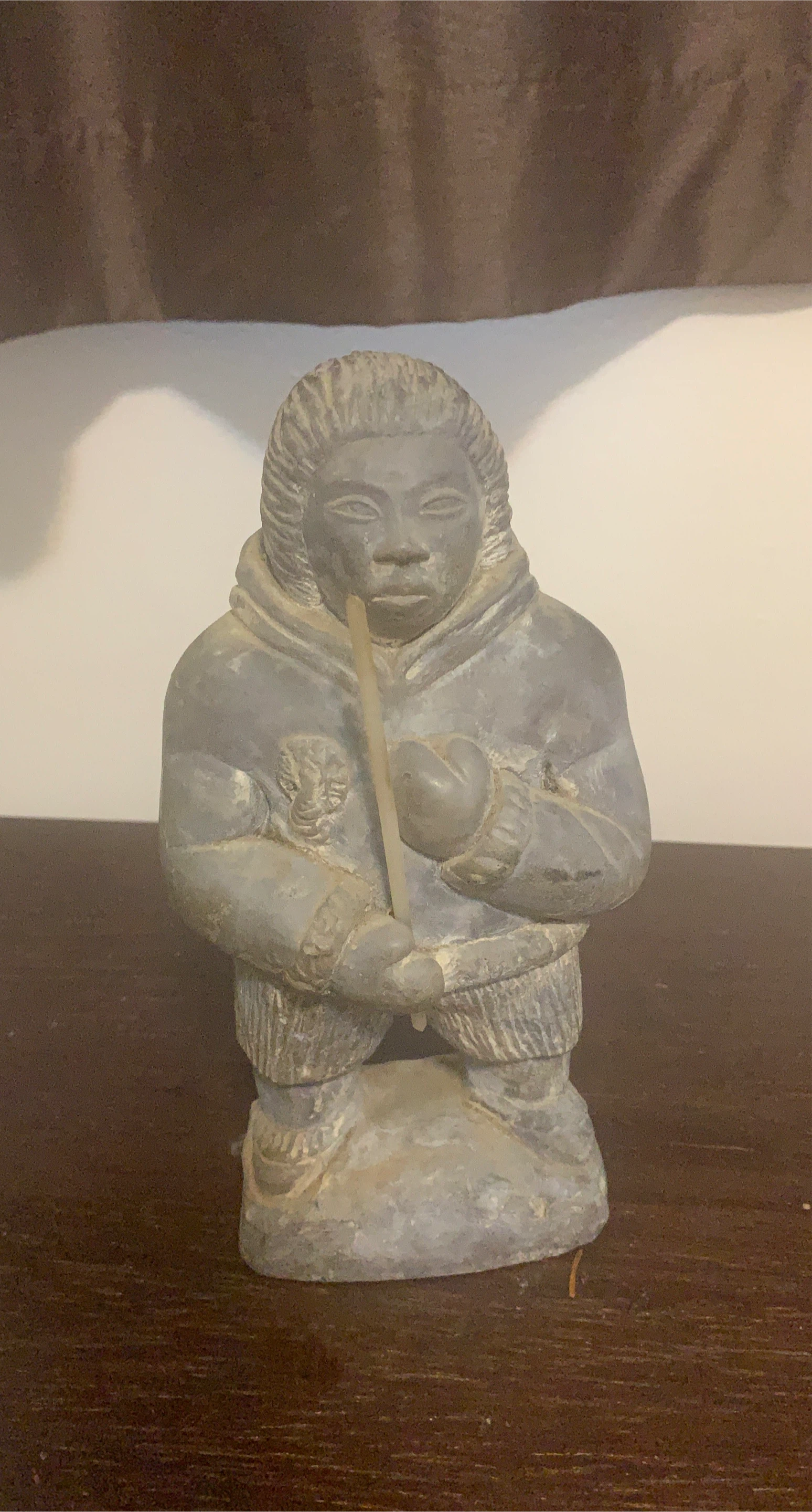 38Unique Inuit stone carving of a figure with a fishing spear. This piece would make a great addition to any collection or as a standalone decorative item