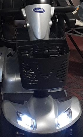 Mobility scooter in a silver finish. Features a basket in front. Headlights included. You could use this scooter to enjoy the scenery while out and about.
