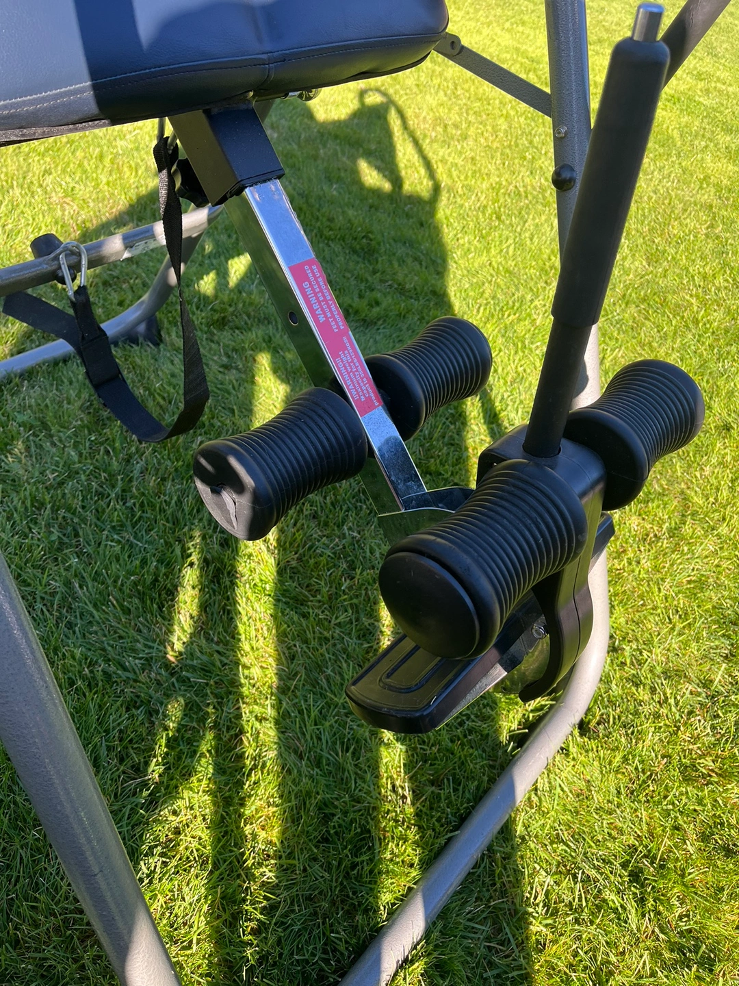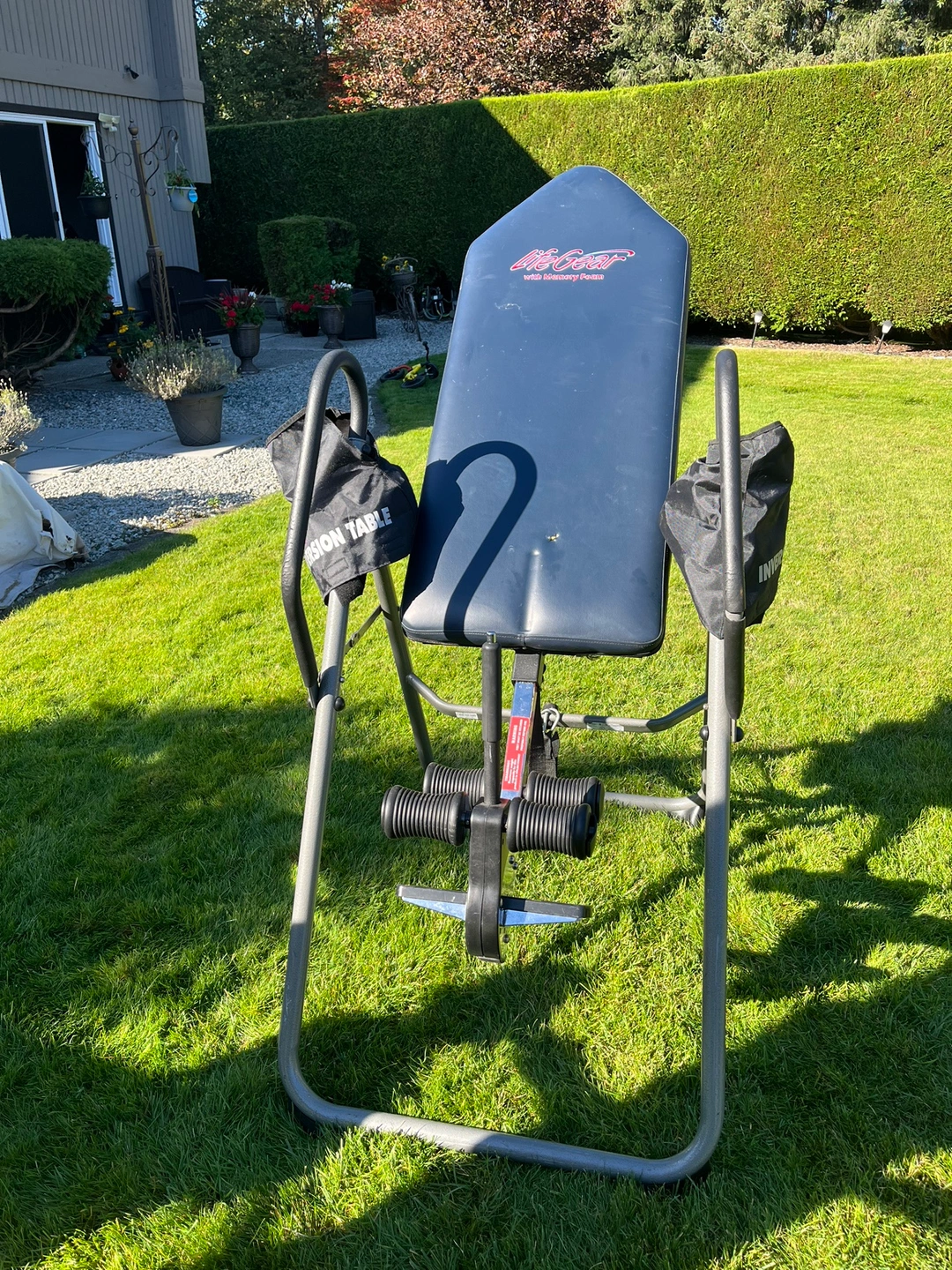 20Inversion table with adjustable height and handles. Includes leg straps and carrying bags. Small rear in bed