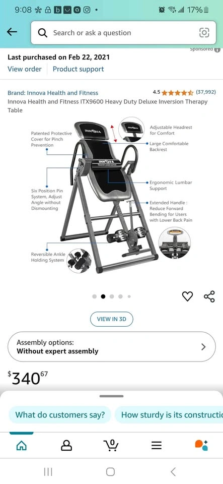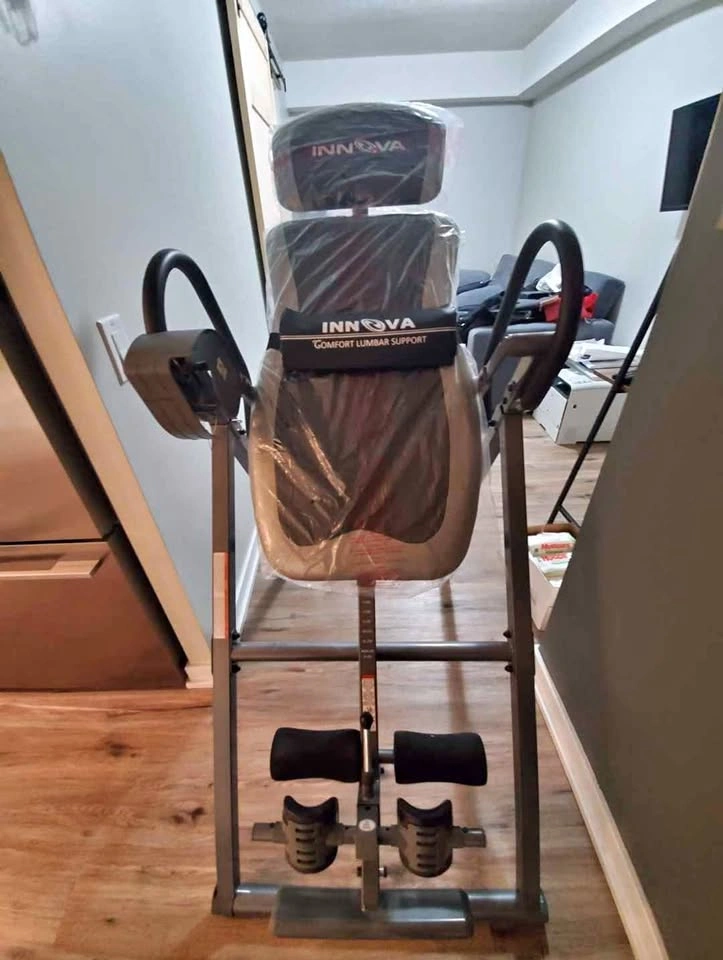 Innova Health and Fitness inversion table. Heavy duty construction. Adjustable headrest. Ergonomic lumbar support. Patented protective components. Six position pin system. Reversible ankle holding system. Extended handles. Used only few times - moving sale.