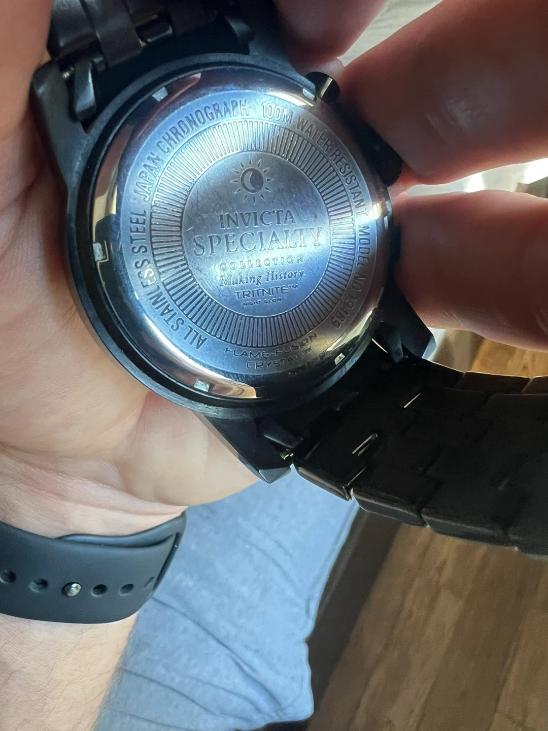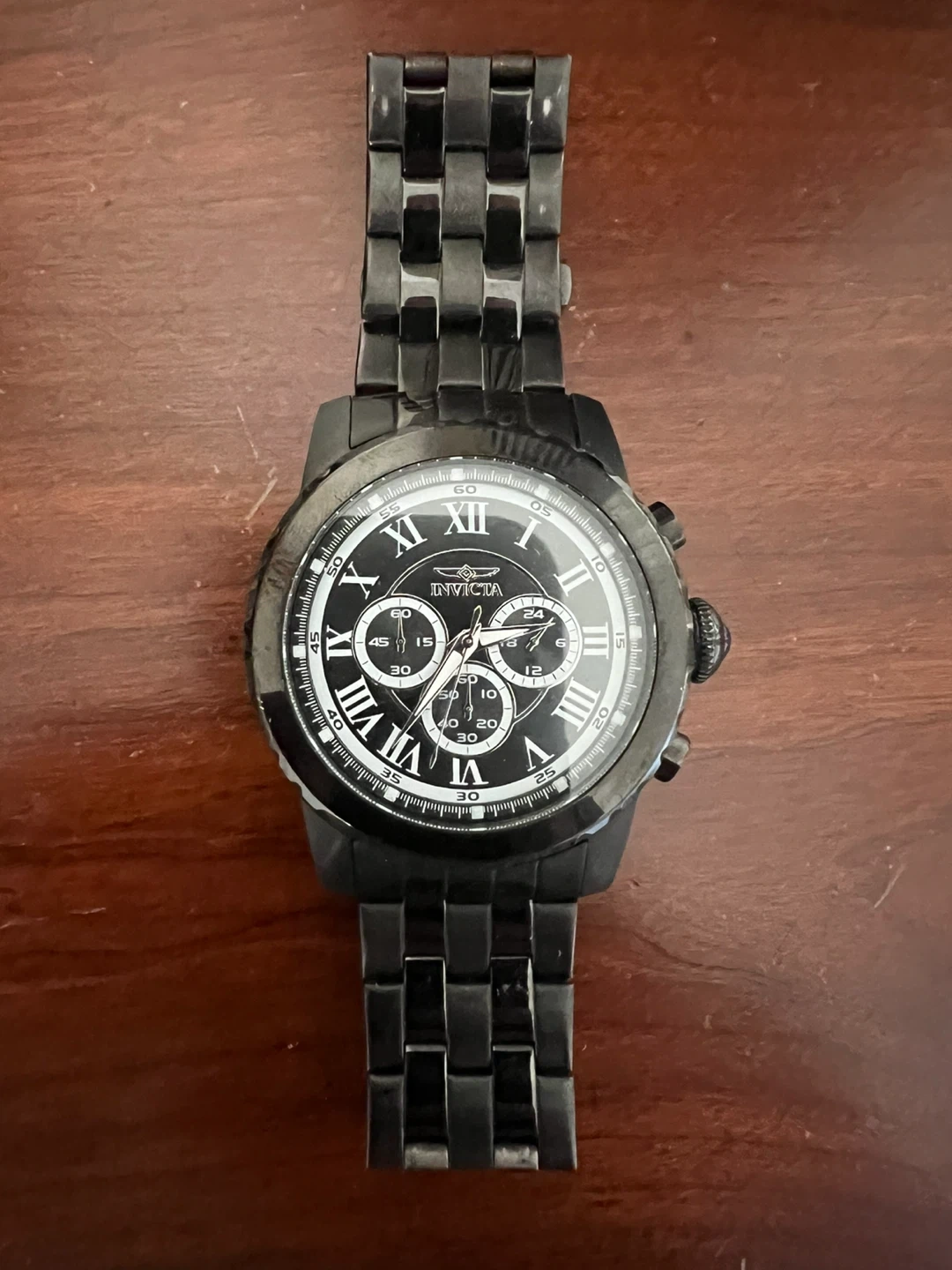 10Selling a used Invicta Specialty Collection Trinite Chronograph watch. It's a stylish timepiece with a black stainless steel band and a black dial featuring Roman numerals. The watch is water resistant up to 100m. The model number is 19389. Needs a battery. Only been worn a few times