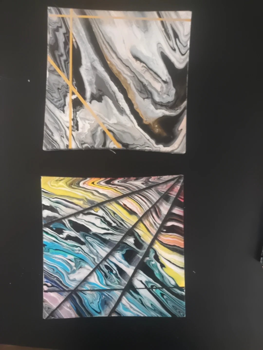 Selling two unique fluid art paintings! One features a striking black, white, and gold marble effect with geometric gold lines. The other is a colourful piece with a geometric design featuring blues, yellows, and other vibrant colours. They would be a great addition to any home!