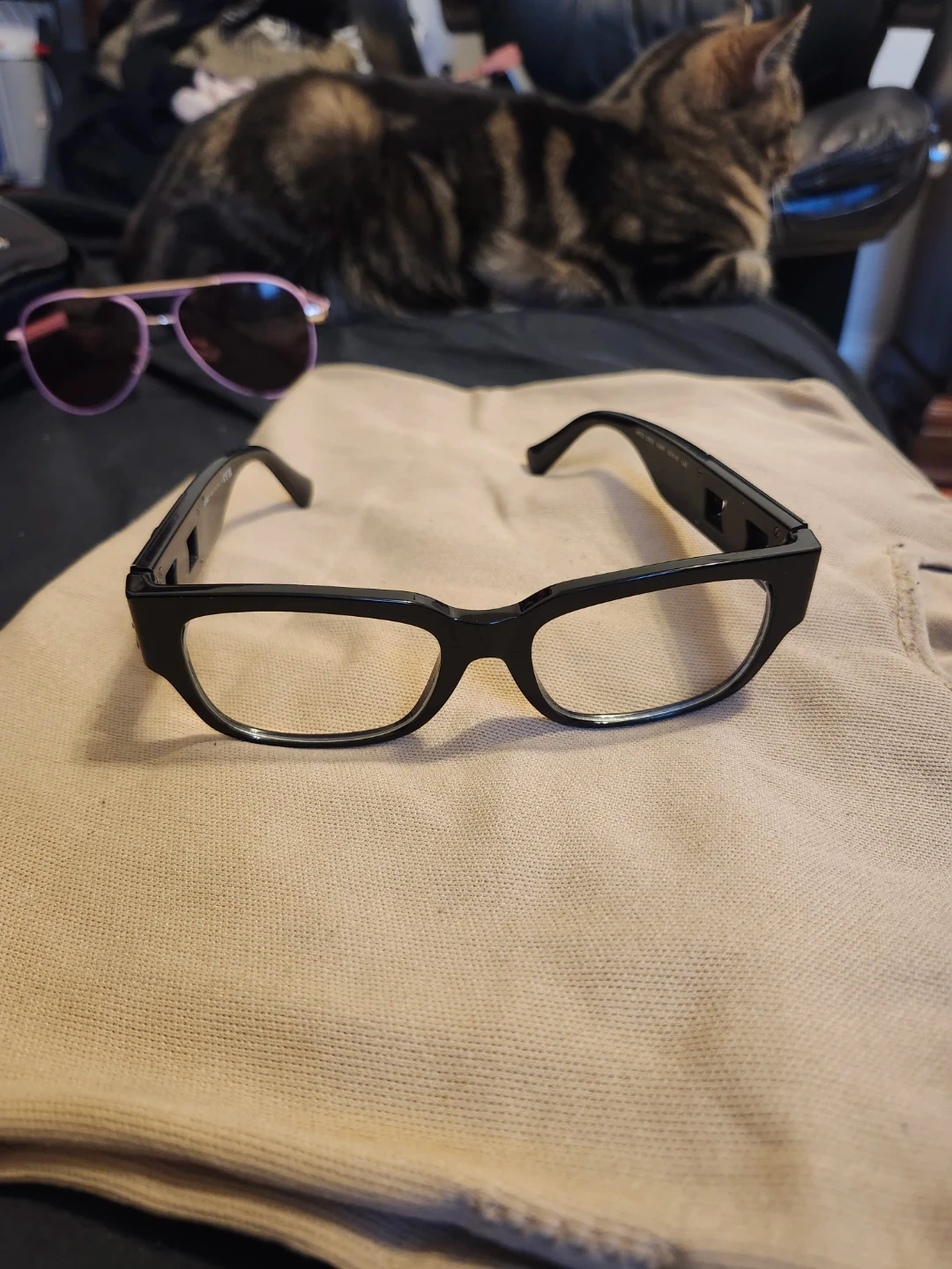 Versace eyeglasses with a black rectangular frame. Made in Italy. Frame measurements are 53mm for the lens width, 18mm for the bridge width, and 140mm for the temple length. These would be a stylish choice for anyone needing prescription lenses.