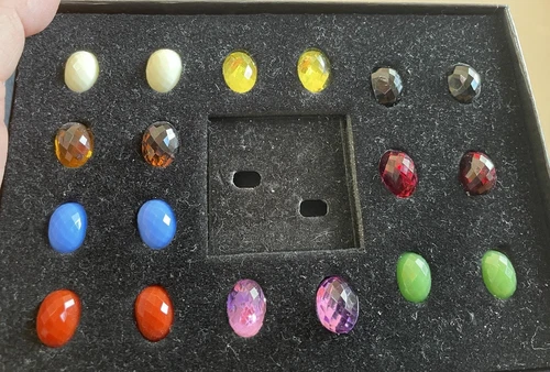 JOAN RIVERS CLASSIC COLLECTION PIERCED EARRINGS SET LOOKS NEW IN BOX - I AM CONSIDERING IT PREOWNED AS THE BOX IS OPEN. The Earrings and 10 pairs of Interchangeable facetted Cabochons all appear to be in like new condition. Colors include Ivory, Periwinkle, Amber, Orange/Red, Purple, Black, Green, Turquoise, Ruby Red & Yellow. Some are opaque some are clear. They may all be some form of acrylic I’m not sure. In any case they are lovely and will make a wonderful addition to your Joan Rivers favorites. Thank you.