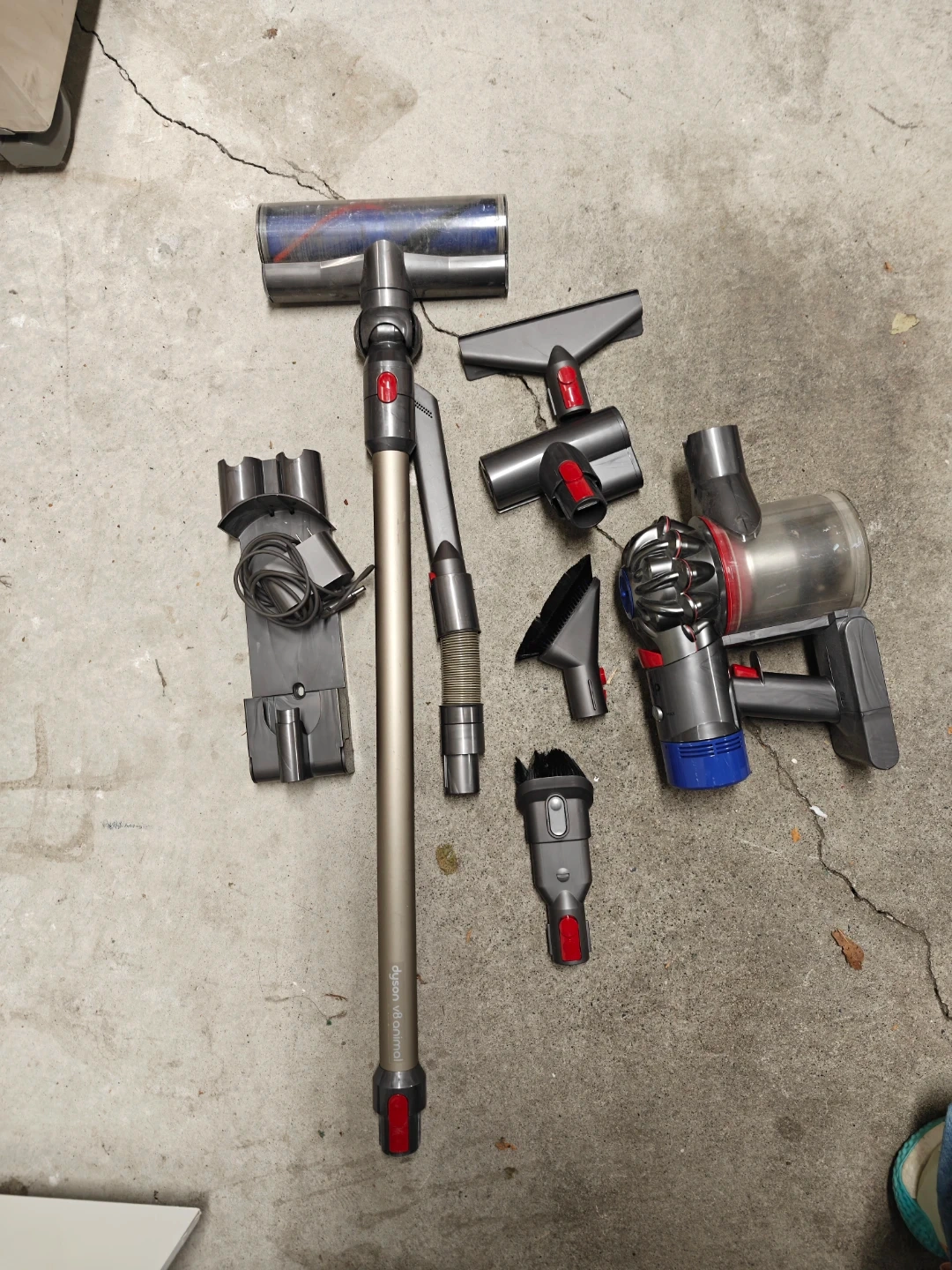 Dyson V8 Animal cordless vacuum cleaner. It comes with multiple attachments, as pictured. Great for cleaning up pet hair and getting into hard-to-reach places!