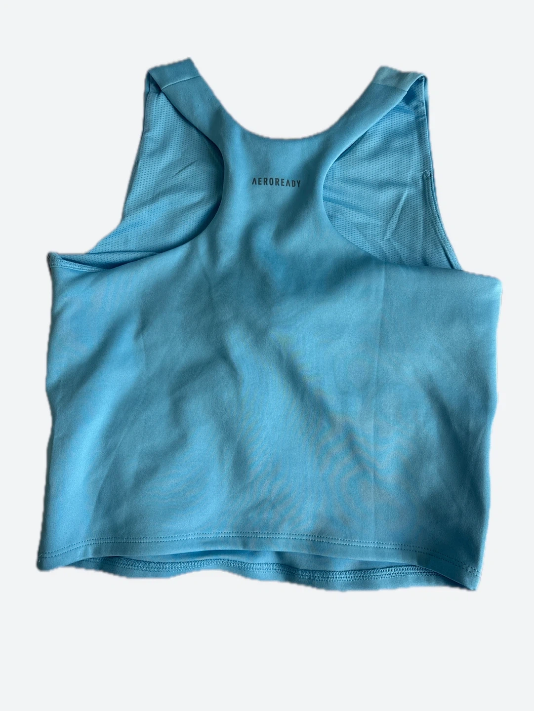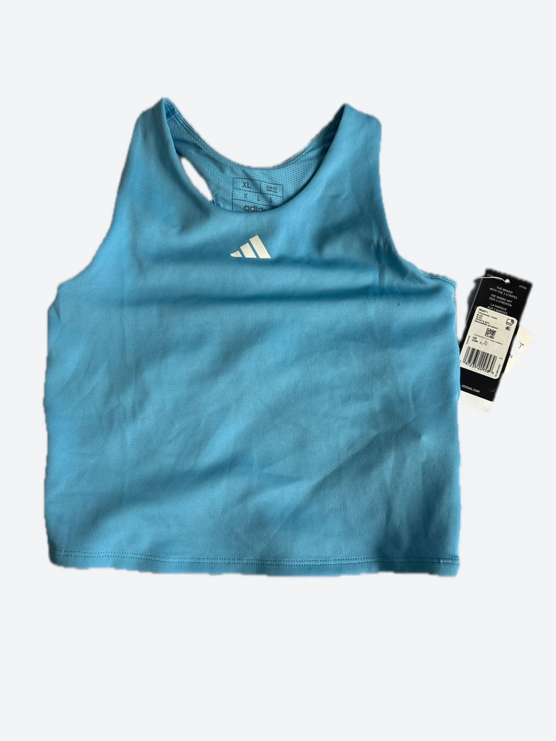 This Adidas tank top is light blue and size XL. It features AEROREADY technology. Made with polyester.